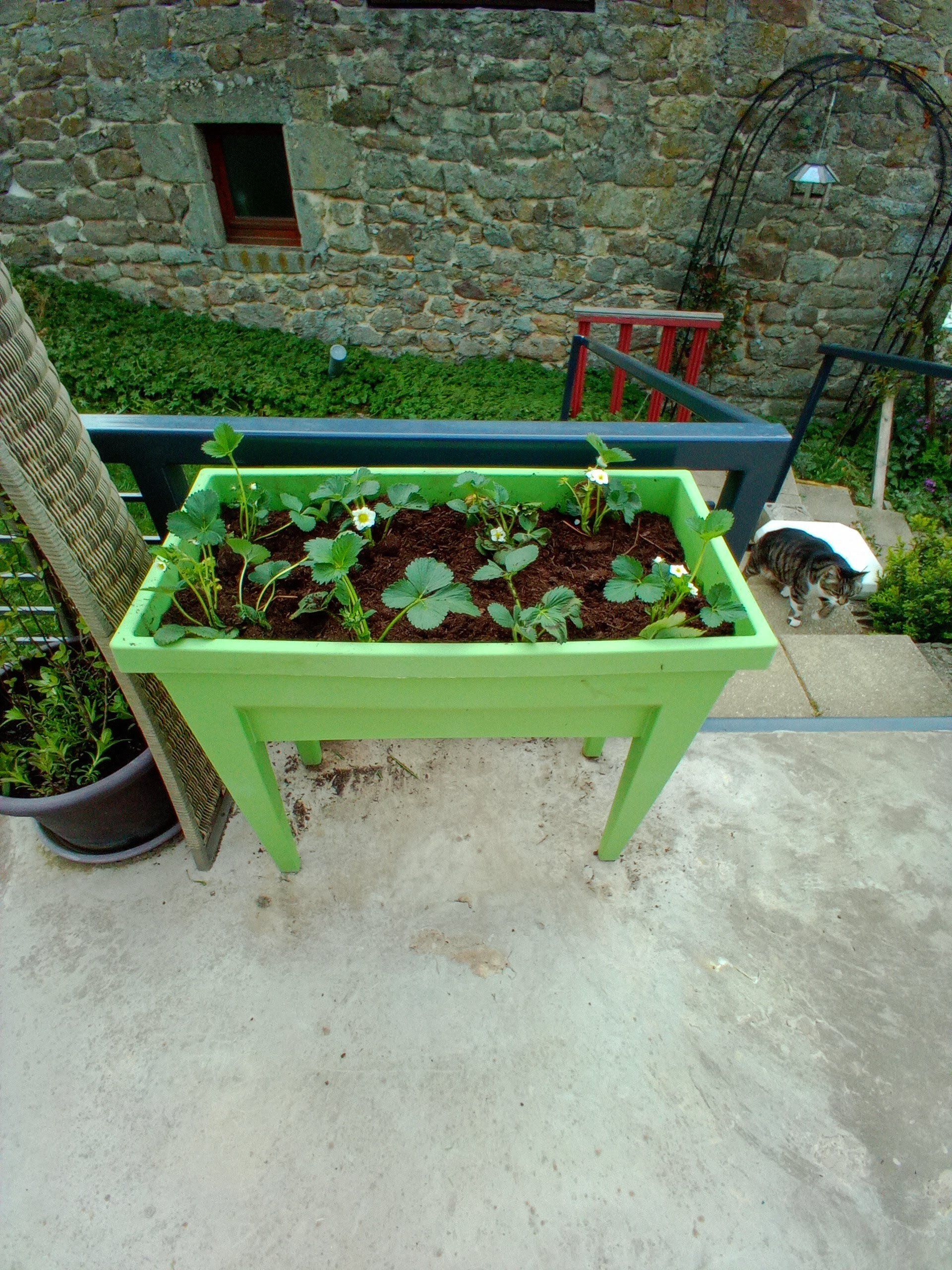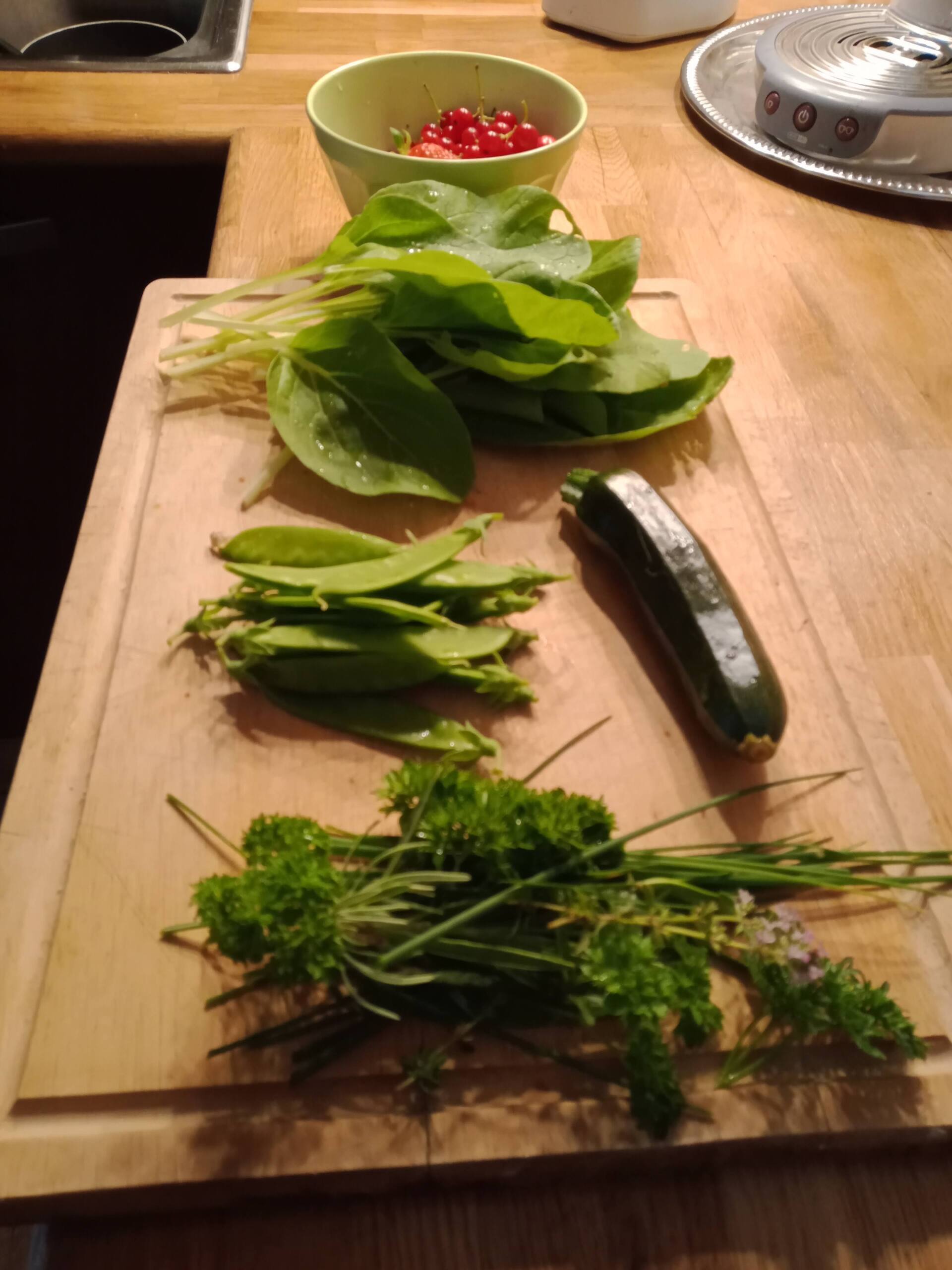 Het weer was lekker met af en toe een bui, met de bosmaaier rond, eerste aardbei en sla uit de tuin, enz.....