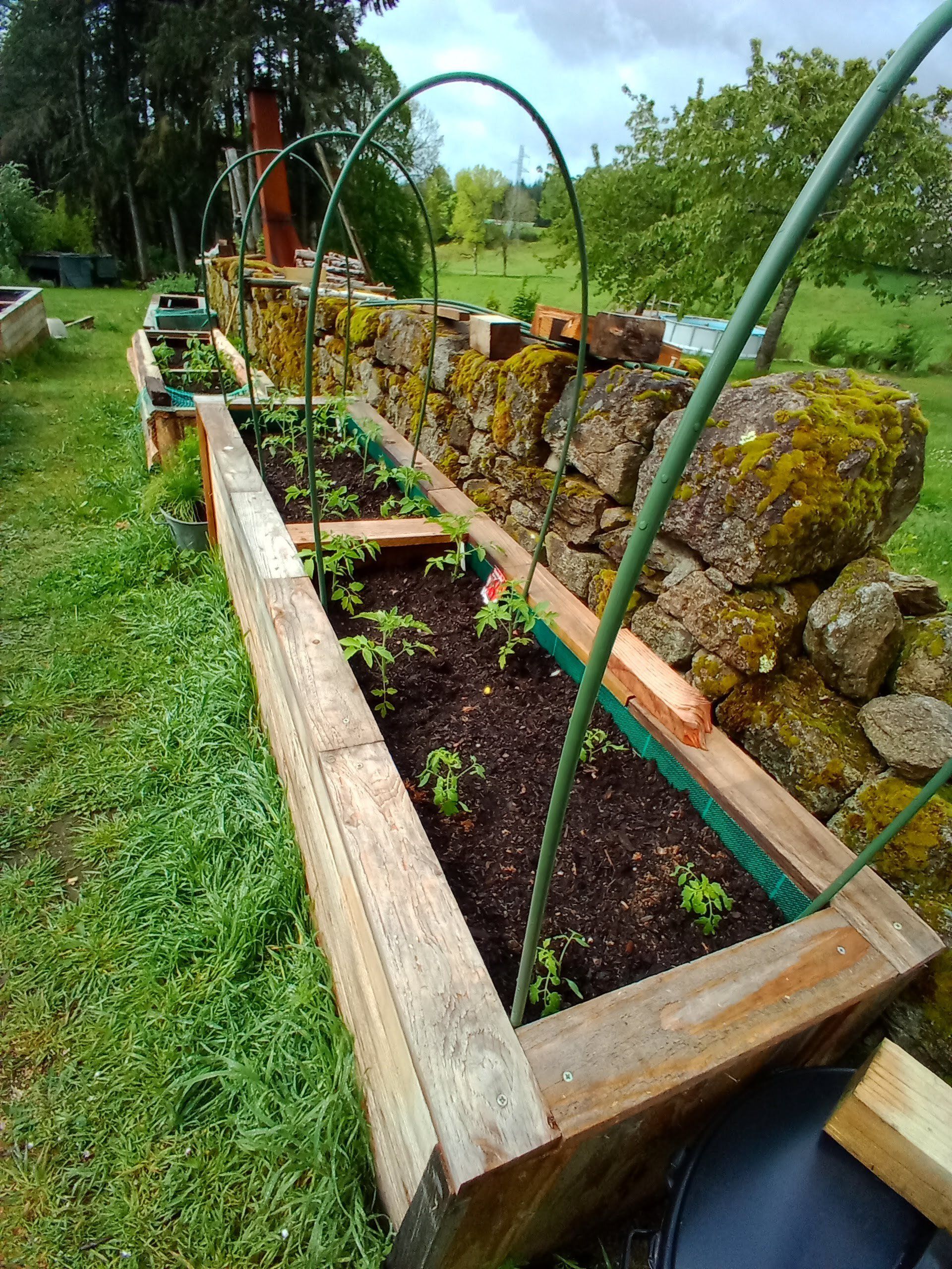 Eindelijk mooi weer, 23 graden, afdak voor de tomaten klaar, compostbak klaar, plantjes verpoten, enz.....