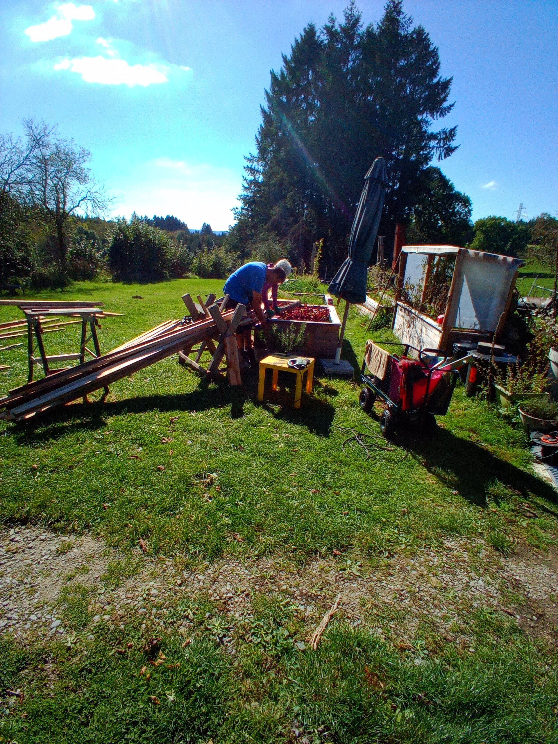 We hebben de hele week mooi weer gehad. Mijn broer en ik zijn dagelijks een paar uur bezig geweest met het bouwen van de kontruktie voor de groenten kas. Mijn schoonzus kan helaas niet veel doen omdat ze net een knie operatie heeft gehad. Zij zit heerlijk in de zon te borduren en ondertussen kan ze onze vorderingen zien vanaf het terras.