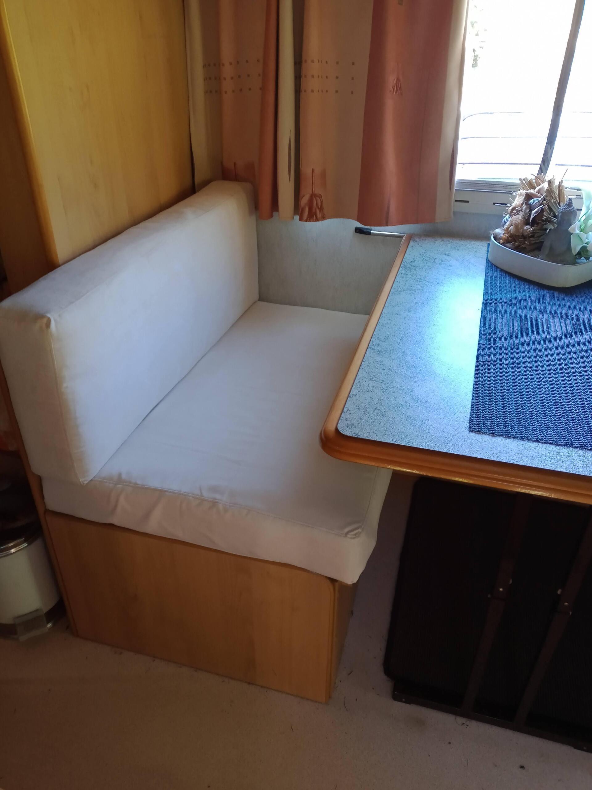 Ondertussen dat we aan het bouwen waren heeft mijn broer ook nog nieuwe bekleding geknipt voor de kussens van de camper. De oude bekleding was vuil en gescheurd. En mijn schoonzus heeft die hoezen in elkaar genaaid. Mijn broer en zijn vrouw hebben voorheen een bedrijf gehad in meubelstoffering. Zaterdagmiddag toen we klaar waren met de groenten kas, heeft mijn broer die nieuwe hoezen om de kussens gedaan. Ik ben hier erg blij mee. Wat staat het mooi.