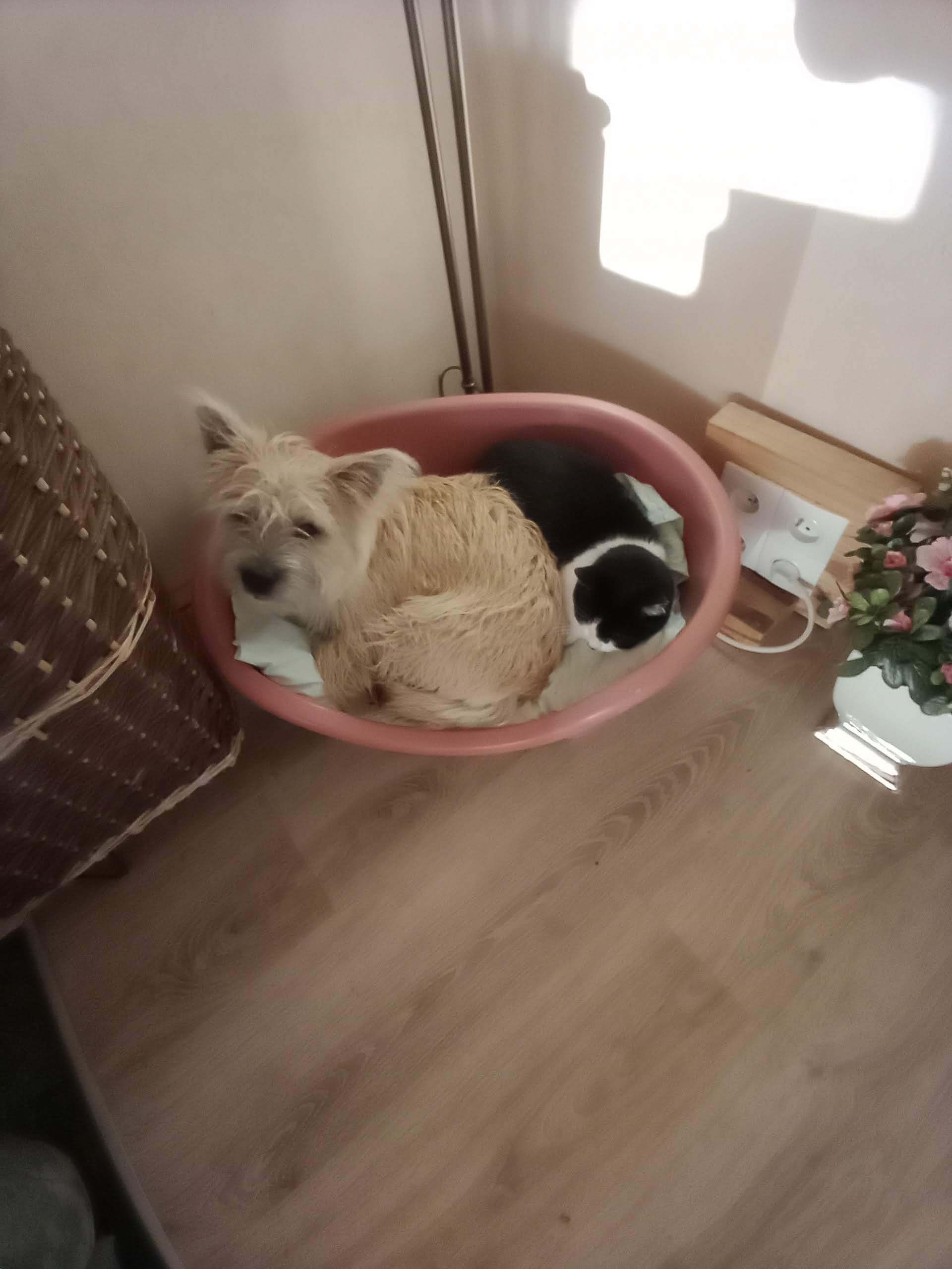 En Bailey vindt het heerlijk om weer vrij rond te kunnen lopen. Dat was in Nederland wel anders. Het leuke is dat hij nu alle poezen kan besnuffelen, zonder dat ze er vandoor gaan. En Kika ligt zelfs samen met hem in de mand.