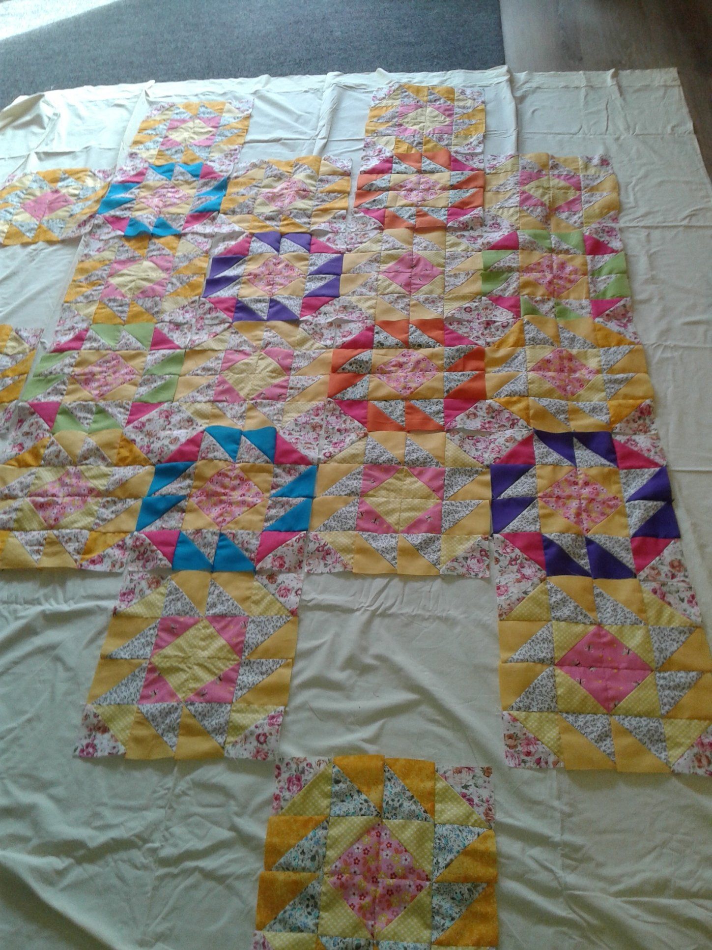 Als het weer minder mooi is buiten, ben ik binnen bezig met de quilt voor mijn kleindochter. Lapjes knippen en die dan weer aan elkaar naaien. Inmiddels heb ik 20 blokken van 30x30cm klaar. Ik heb ze even op de grond neer gelegd om alvast een indruk te krijgen hoe het wordt. Ik ben zelf erg tevreden.