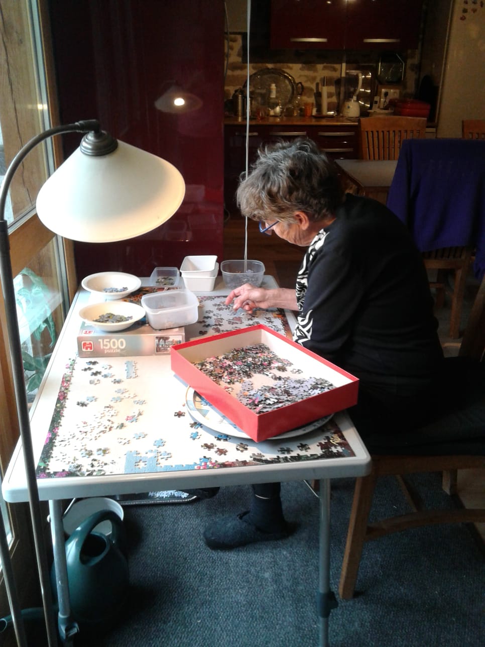 Mijn zus heeft een paar maanden bij mij in het vakantiehuis gewoont omdat haar huis was verkocht. We zijn een tijdje samen bezig geweest om haar huis leeg te halen. En toen het huis bijna leeg was begon de lock-down door het Corona virus. We konden geen kant op en alle winkels waren dicht behalve de noodzakelijke winkels. En als we boodschappen moesten doen, of naar een huisarts, moesten we een formulier bij ons hebben om te verantwoorden waarom we onderweg waren. En uiteraard moesten we vanaf het begin een mondkapje dragen en onze handen ontsmetten. Mijn zus heeft in die tijd veel gepuzzeld en ik heb vele mondkapjes gemaakt voor familie en vrienden.