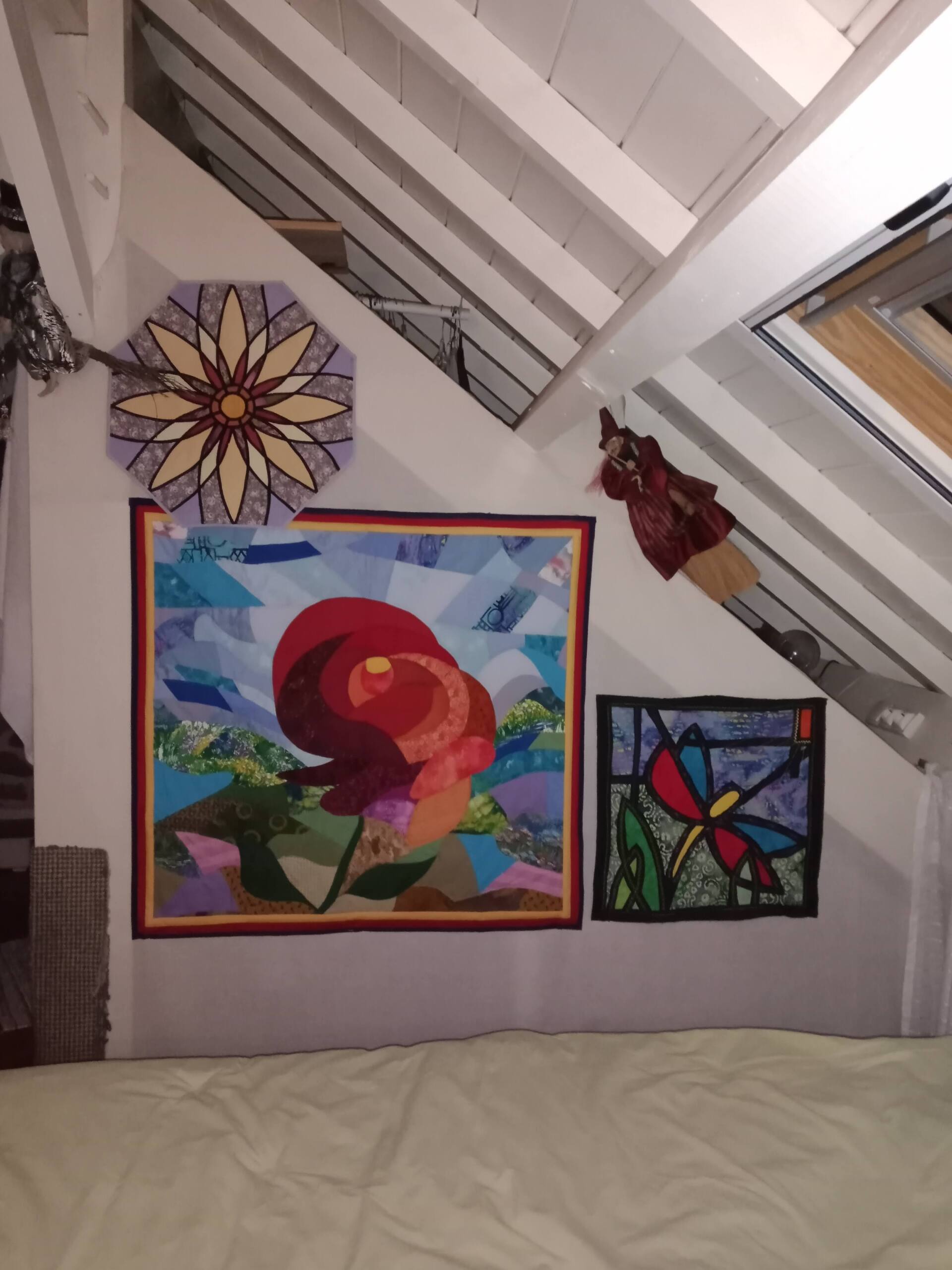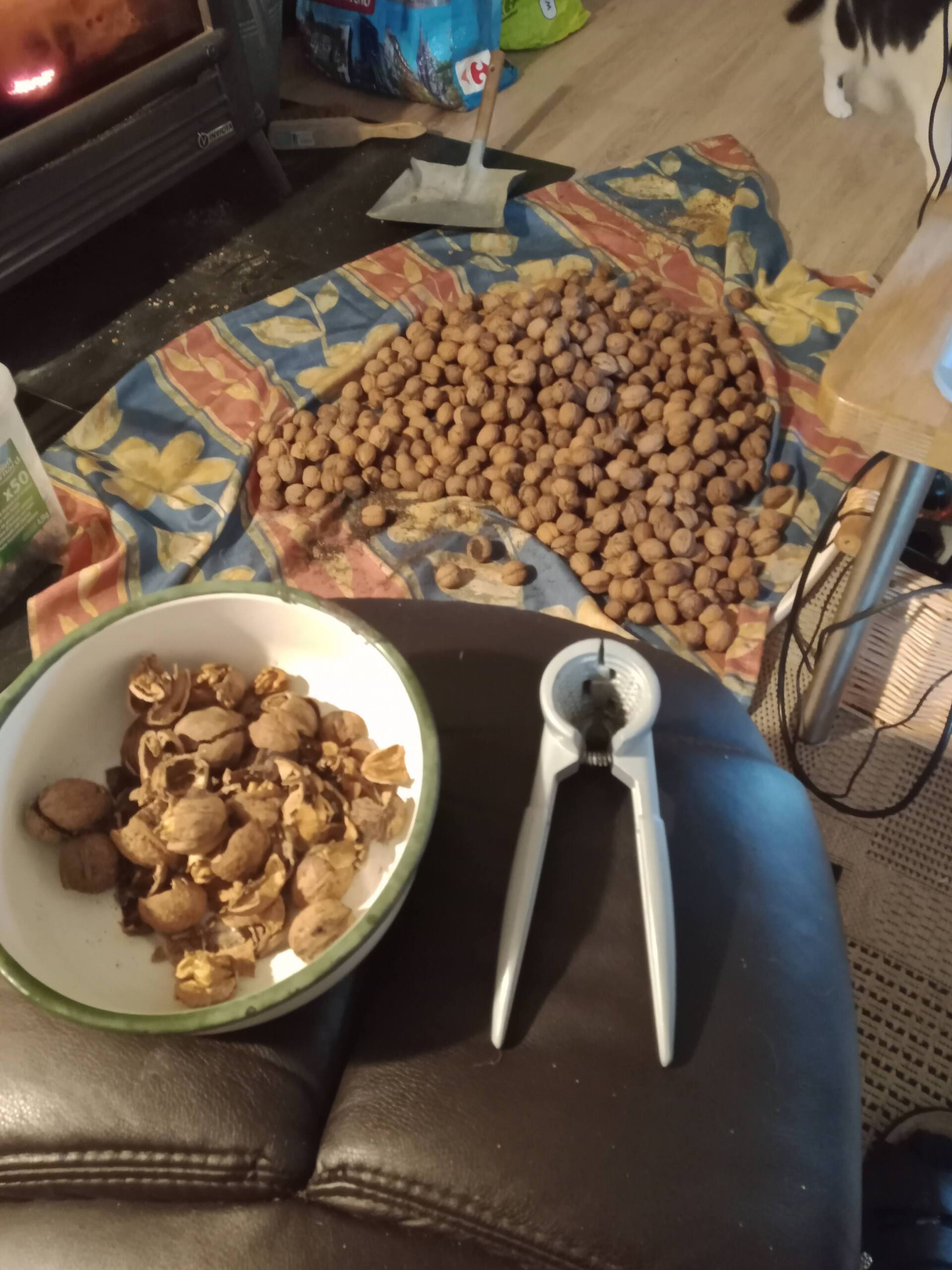 Eindelijk heb ik de tegeltjes, achter mijn kachelpijp, aan de muur geplakt en gevoegd. Stukje bij beetje wordt het steeds mooier in mijn eigen huis. Ik heb nieuwe gordijnen genaaid en ik heb een aantal quilts afgemaakt. Tussen de regenbuien door heb ik vele hazelnoten en walnoten verzameld. Heerlijk gezond voor de winter.