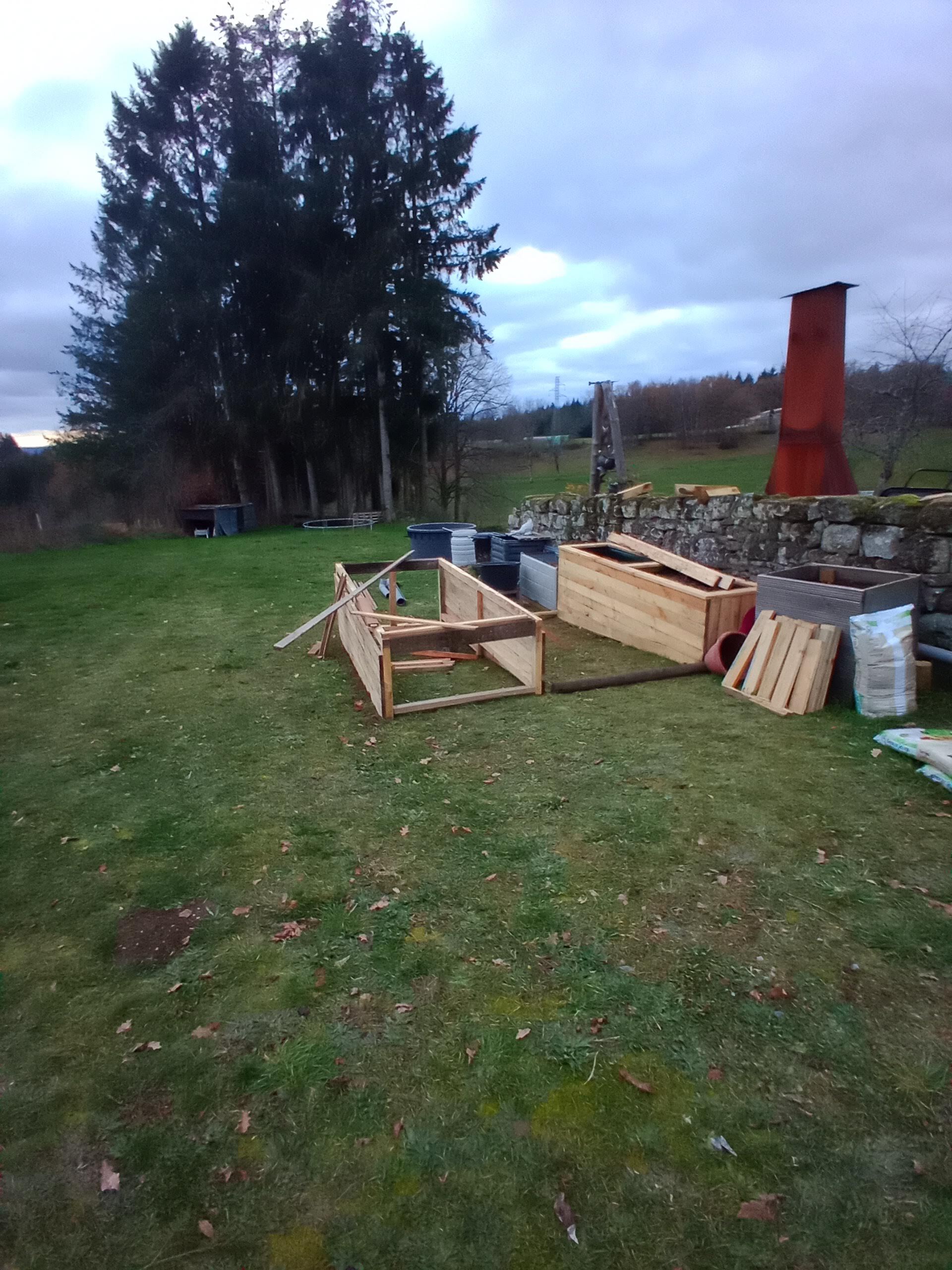 Die verhoogde groentebakken moesten ook worden gevuld met takken, houtblokken, bladeren en allles wat maar kan verteren. De bovendste 15 cm tuinaarde komt in het voorjaar uit zakken. Ik heb veel opvulling van de bakken uit de directe omgeving gehaald. Uiteraard met de trekker en de aanhanger. En ik heb oude koemest uit de weilanden van de buren gehaald En verdeeld over de bakken. Zo kost het wel veel tijd maar weinig geld. Daar houd ik van. Zoveel mogelijk hergebruik.