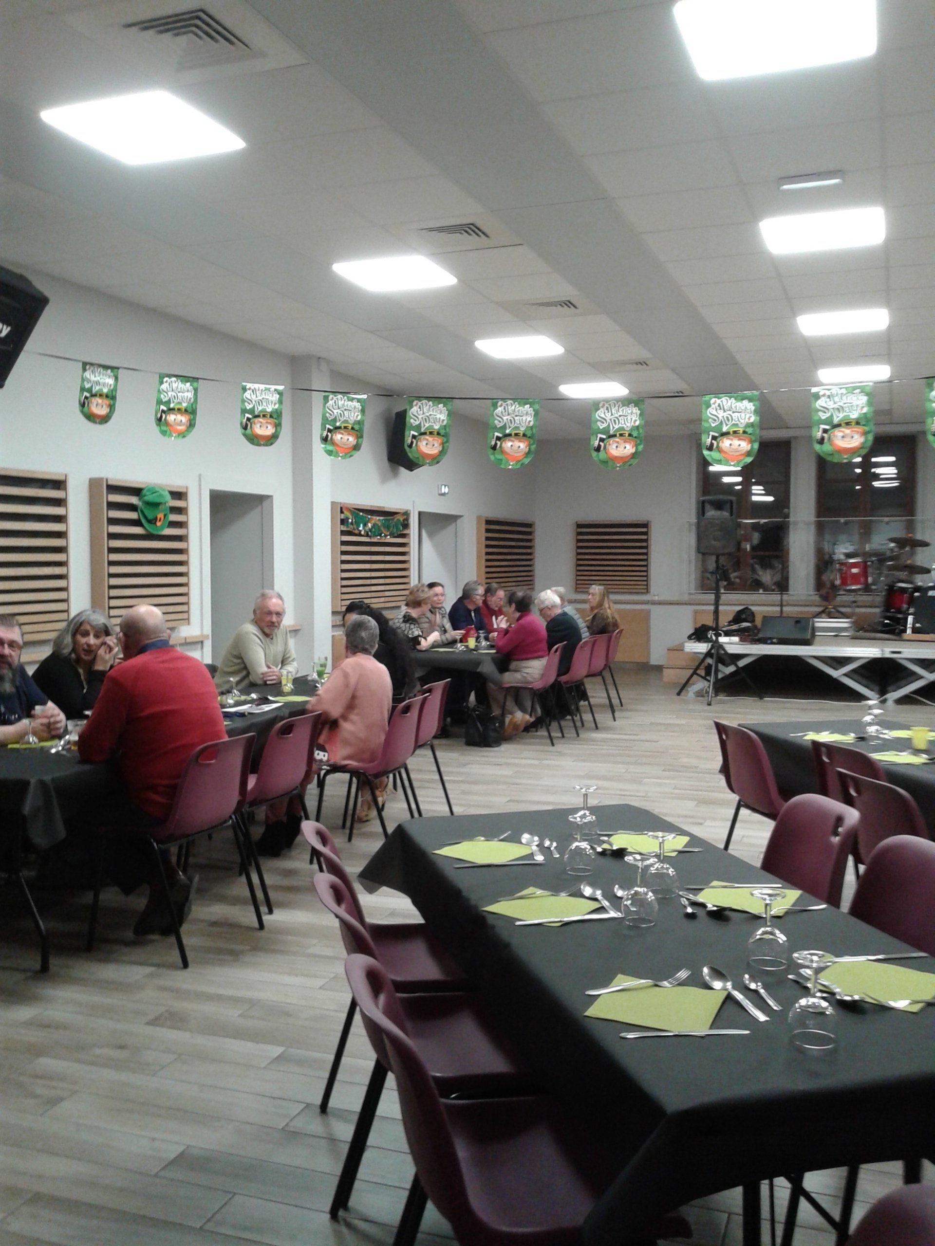 Zaterdag 23 maart hebben we het St. Patrick feest georganiseerd met het feestcomité van Sérandon. Het thema was Ireland. Vrijdagavond vanaf 18.00 uur zijn we begonnen met de voorbereidingen van de maaltijd: Irisch Stew. We moesten voor 70 mensen een maaltijd maken. Dus vele aardappelen schillen tot je vingers er van zeer deden. Daarna de wortelen schillen en in stukjes maken, uien schillen en snijden en nog vele andere groenten. De brokken vlees moesten in koekenpannen worden aangebraden en daarna ging alles in een grote pan met vele liters bouillon en Guiness bier. Toen dat stond te pruttelen konden we zelf eten. Bij het restaurant Lisa hebben we een paar pizza's besteld en lekker bij onszelf, in de zaal, opgegeten onder het genot van een drankje. Toen mijn vriendin en ik niets meer konden doen zijn we om 23.00 uur naar huis gegaan. De volgende middag zijn we verder gegaan met het klaar maken van de zaal en nog een aantal voorbereidingen voor de maaltijd. We hoefden zelf niet alles te doen omdat de voorzitster een vriendin had gevraagd, die kok is, om het voorgerecht en het nagerecht te maken. Om 17.00 uur kwamen de muzikanten binnen van de groep "Kalfa" om hun instrumenten op te bouwen. Deze groep speelt Ierse muziek.