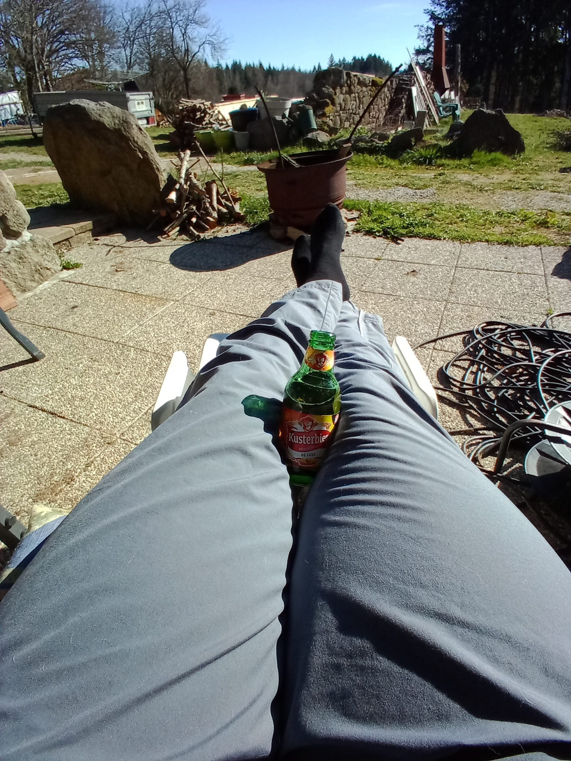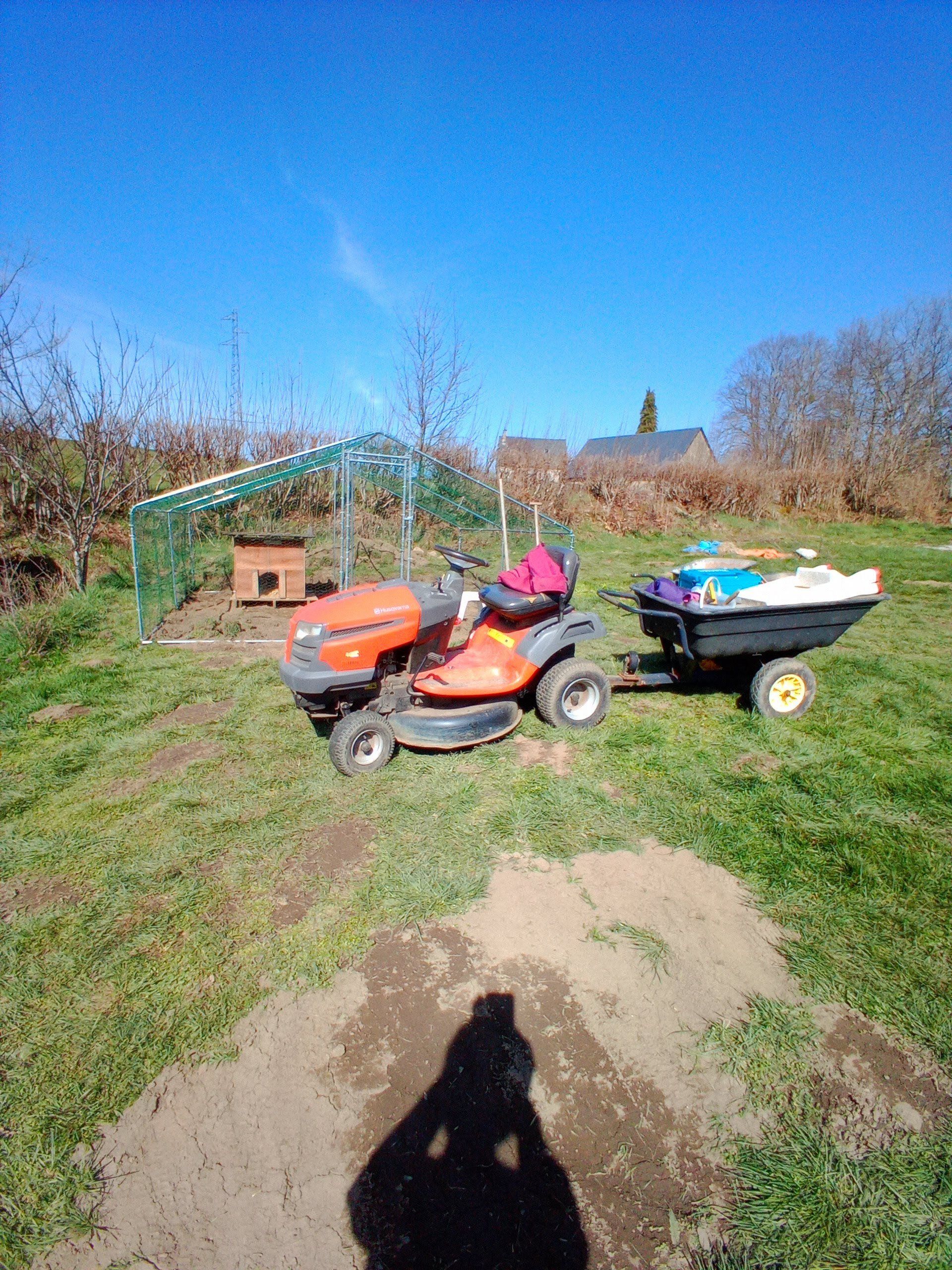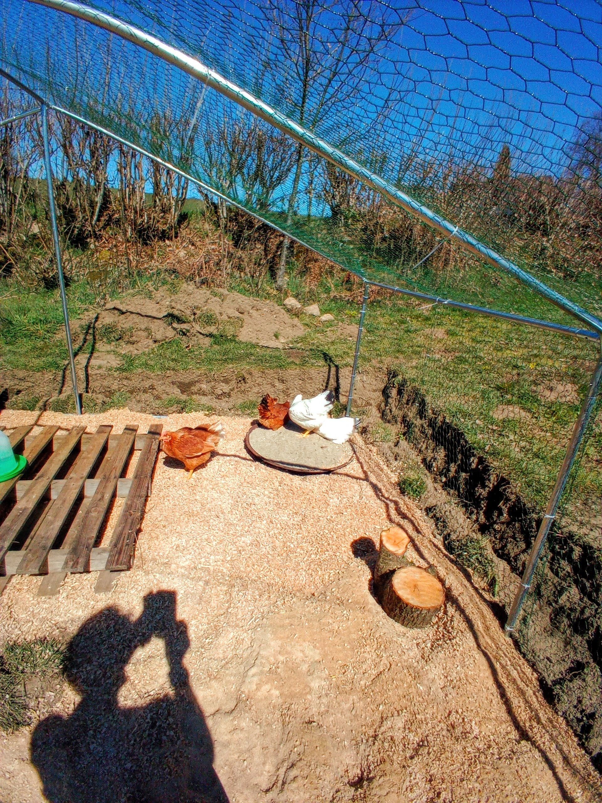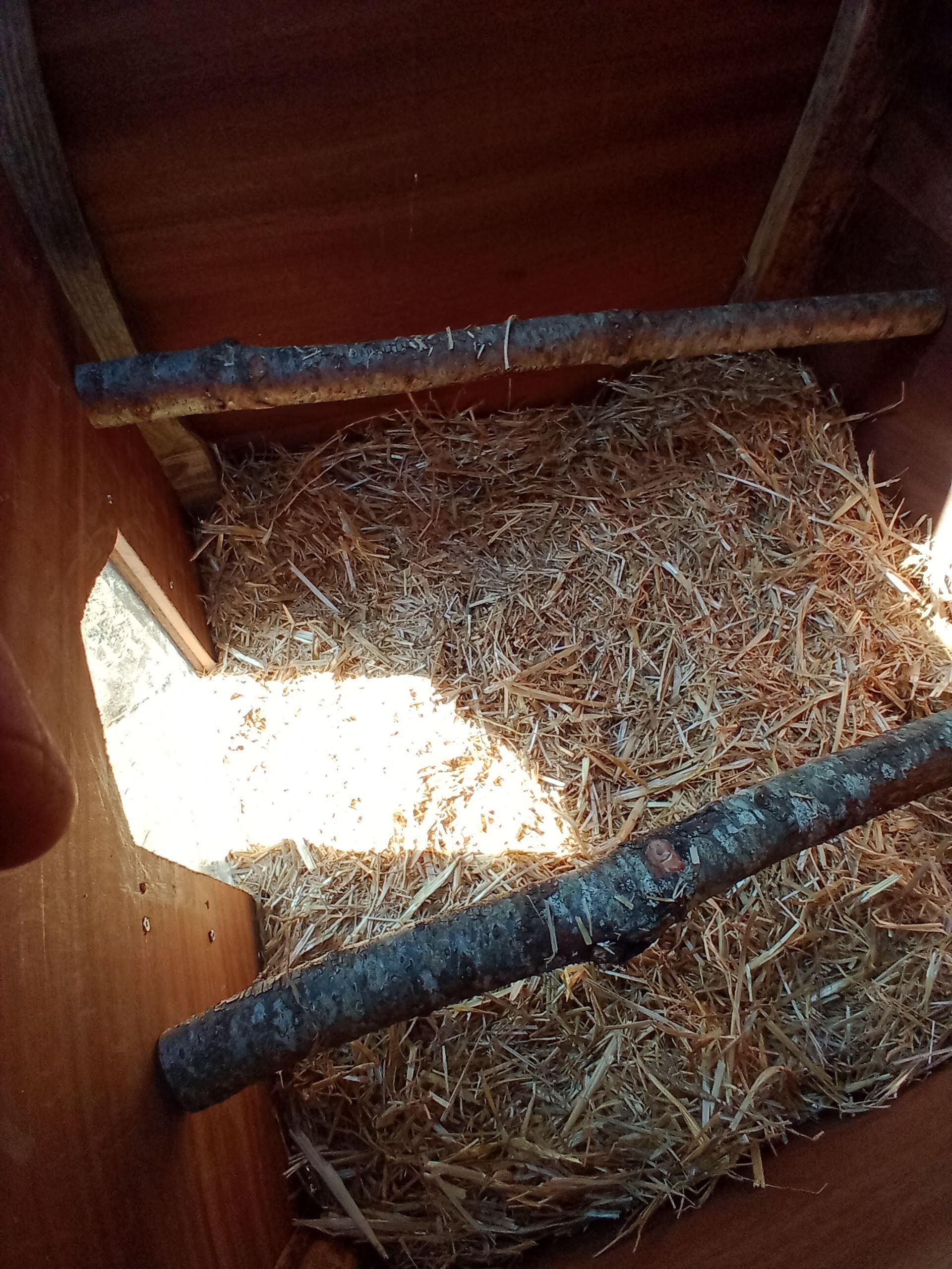 Maandag heb ik het tijdelijke nachthok in elkaar gezet. De bodem is gemaakt van een pallet, de zijkanten van een oude kast, het dak van een stuk OSB plaat, de slaapstokken van takken van dennenhout uit mijn bos en het deurtje van een stuk plexieglas wat ik nog had liggen. Achter in de middag ben ik nog naar de zagerij gereden om grote zakken met zaagsel van kastanjehout op te halen voor in de kippenren. En toen kon ik alles inrichten. Stro in het nachthok, zand in de ronde zandbakje en zaagsel over de grond in de ren. Toen dat allemaal klaar was kon ik alle gereedschap opruimen. Nadat alles klaar en opgeruimd was heb ik genoten van een wel verdiend biertje in de zon.