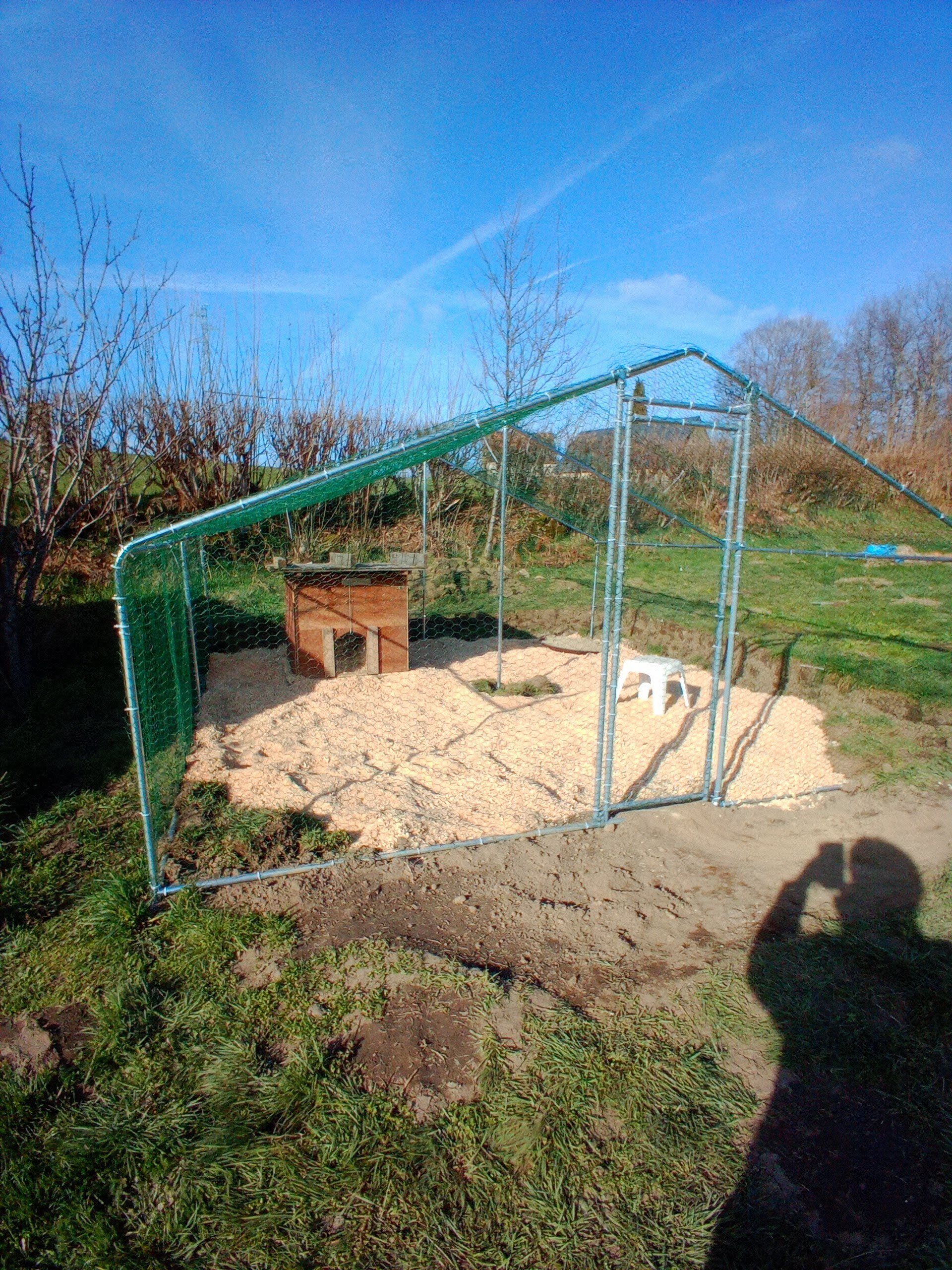 Zaterdagmiddag zijn een vriend en ik begonnen met het in elkaar zetten van de kippenren. Volgens de beschrijving zou je er 1,5 uur mee bezig zijn met 2 personen. Dus niet. Toen we begonnen dacht ik dat het gaas al op maat zou zijn geknipt. Dus niet. We wisten ook niet of ze het gaas ruim hadden berekend. Dus hebben we dat niet te ruim geknipt. Gaas op een rol is niet gemakkelijk te hanteren. En het gaas moest worden vastgemaakt met ty-rips. Na 2 uur stond het geraamte en zat het gaas op het dak. En toen was het etenstijd. Vanwege de avondklok hebben we op tijd gegeten. Ik had Margaritha pizza uit de vriezer gehaald en die hebben we zelf afgemaakt met waar we zin in hadden. Salamie, bacon, ananas en diverse kaasjes. En daarna afbakken in de oven. We hebben gesmuld.