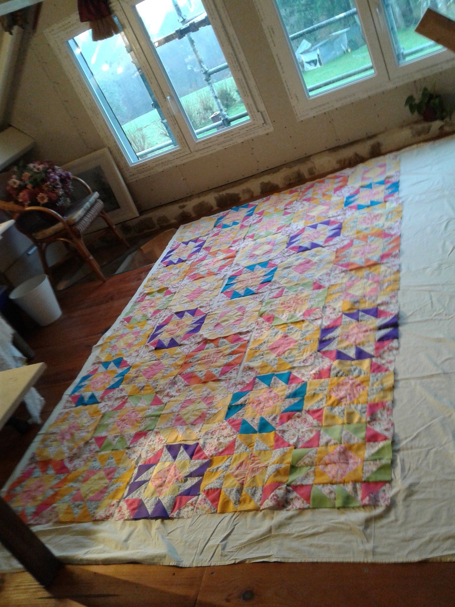 Dinsdag heb ik alle blokken, voor de quilt van mijn kleindochter, op een laken gelegd.