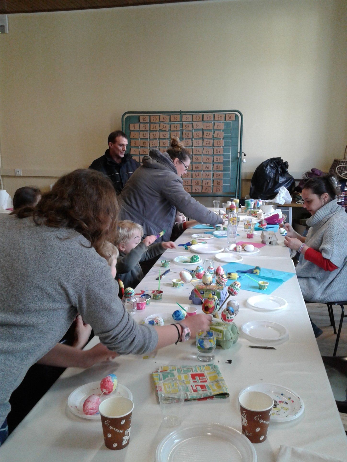 Paaszondag om 9.00 uur hebben we met 6 man de zaal klaar gemaakt en koffie gezet. De eerste kop koffie die we kregen zat al een borrel in. En dat 's morgens vroeg al. Om 10.00 uur kwamen de ouders met hun kinderen aan en konden we beginnen met eieren verven. Er waren eieren gekocht van piepschuim om te verven. De traditie zoals wij in Nederland kennen, eieren koken en verven, kennen ze niet. Ik had bij het uitleggen tijdens een vergadering er niet bij verteld dat je de eieren bij de volgende broodmaaltijd gaat opeten. Dus volgens onze traditie had ik een aantal eieren meegenomen en daar in de eierkoker gekookt. Na afkoeling zijn ze geverfd en later opgegeten. Dat bleek toch een succes te zijn en is er besloten om het volgende jaar verse, gekookte eieren te gaan gebruiken en de Nederlandse traditie te gaan invoeren.