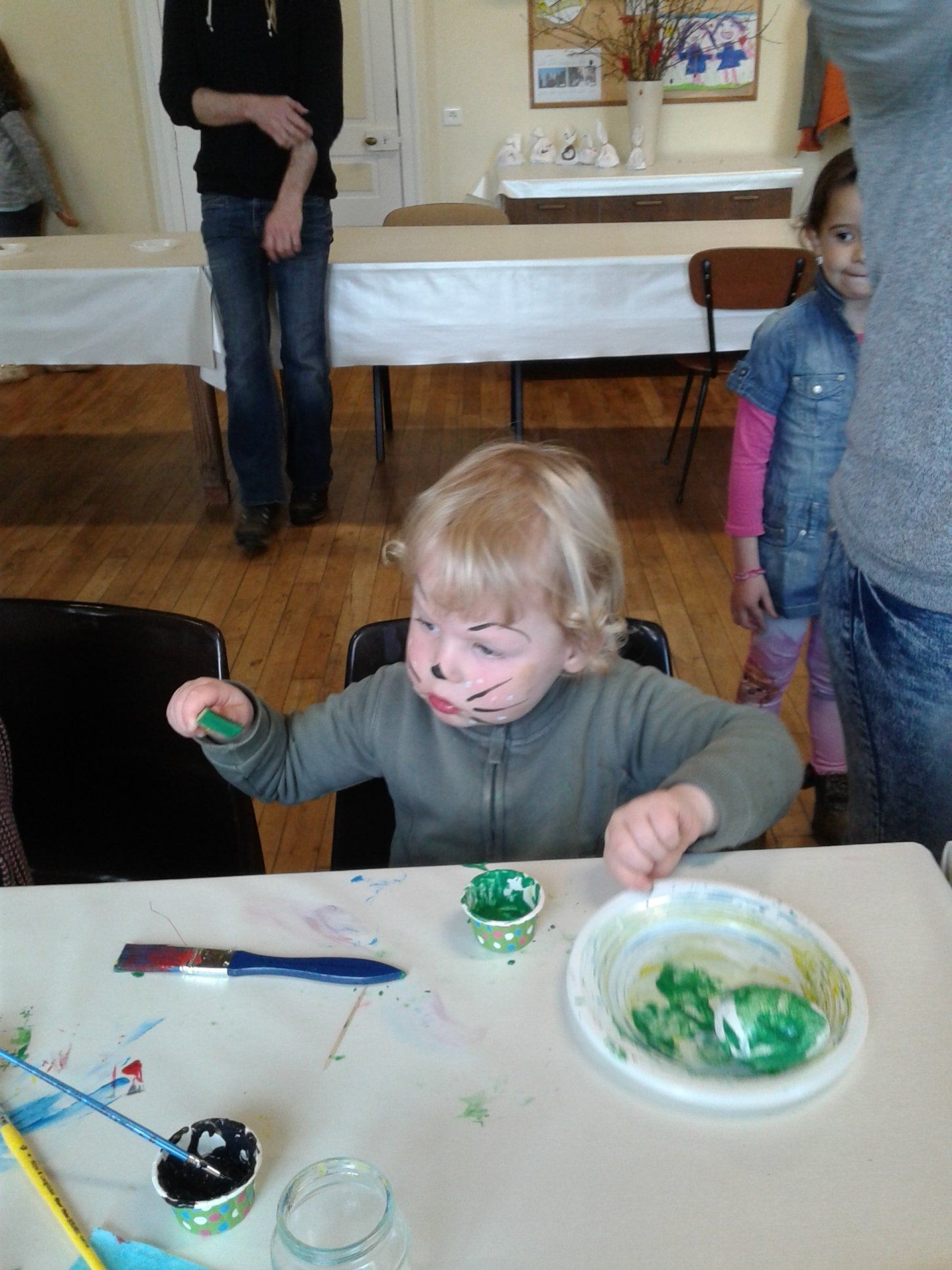 Een aantal kinderen wilden wel geschminkt worden als konijn. De wat ouderen wilden dat niet. Die waren met alles gauw klaar en gingen ergens spelen met hun mobiele telefoon.