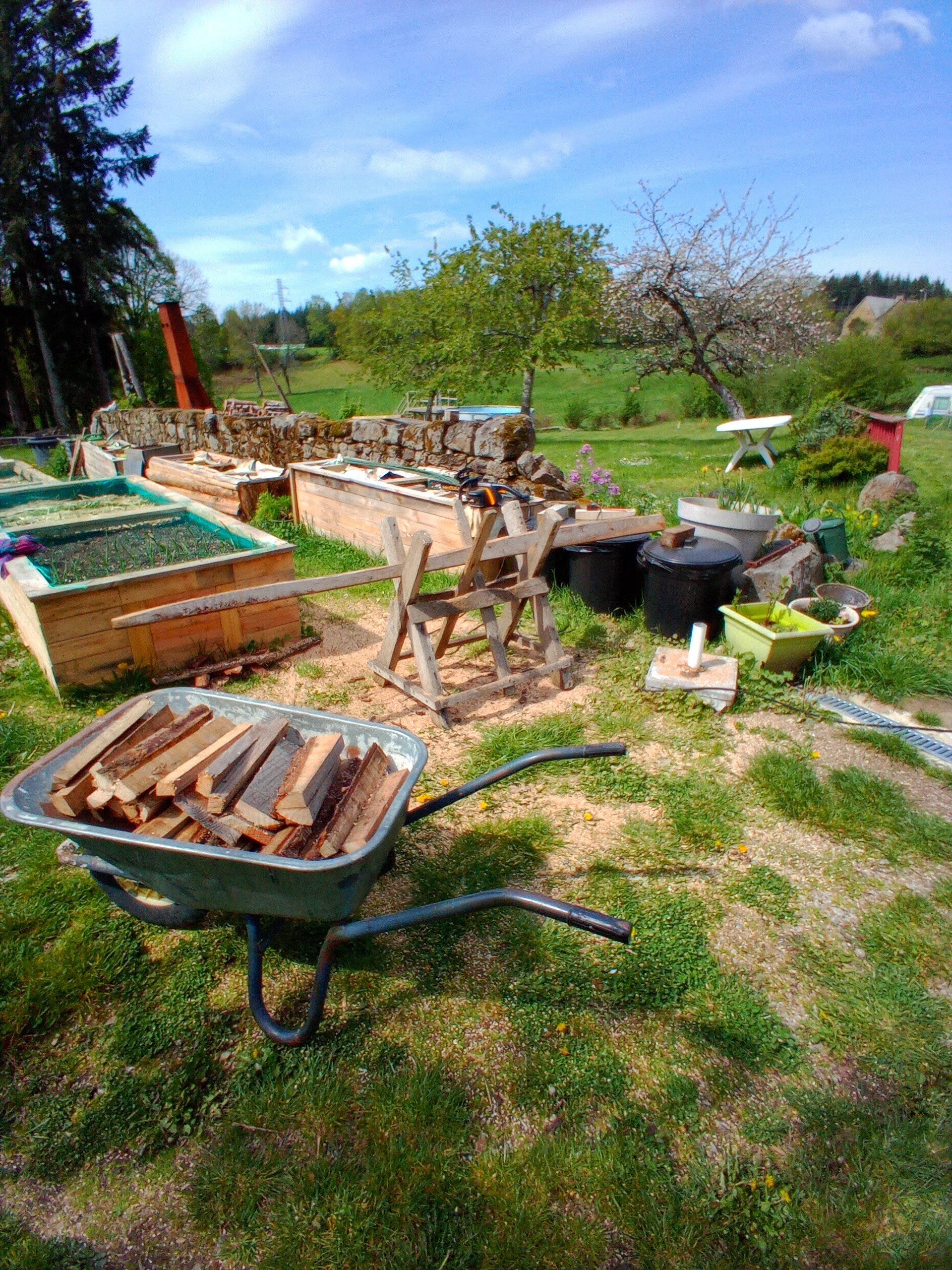 neergelegd. Dat is mooi hout om deze zomer in de buitenhaarden te kunnen branden. Ik kan dit hout niet in de kachel binnen verbranden omdat er beits op zit. Als ik dat wel zou doen, kan die beits zich gaan hechten aan de binnenkant van mijn kachelpijp en dan kan er brand ontstaan. En daar zit ik niet op te wachten. Maar buiten kunnen we er wel een vuurtje van stoken.