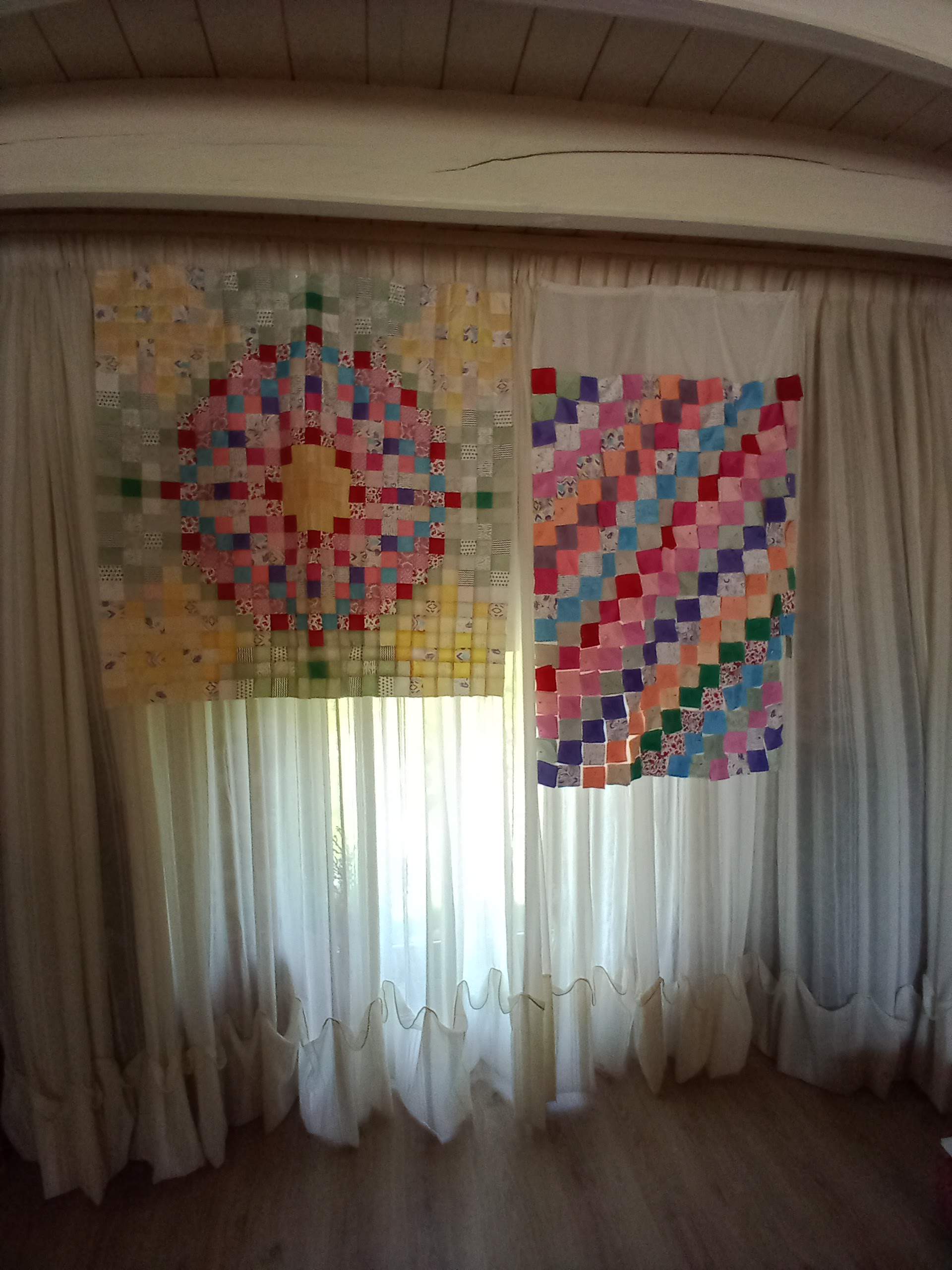 Daaronder komen diagonale strepen. Op de foto kun je de strepen goed zien en dat is maar een 1/4 van de onder en bovenkant. Beide 1/4 delen komen in spiegelbeeld tegen elkaar aan en dan krijg je punten. Ik ben er 2 dagen mee aan het puzzelen geweest. Tenslotte wil ik 2 quiltdekens op mijn bed die hetzelfde zijn. Zoals het ontwerp nu is heb ik niet voldoende lapjes, maar gelukkig heeft een vriendin ze nog wel. 2 jaar geleden hebben we samen lapjes gekocht bij de Action en gelukkig kan ik wat van haar overnemen. Want zij had er nog niets mee gedaan. Quiltsters houden er van om lapjes stof te verzamelen in allerlei kleuren. Je weet maar nooit wanneer je ze kunt gebruiken. Want in elk project gebruik je veel verschillende gekleurde stofjes. Voorlopig ben ik er nog wel mee bezig.