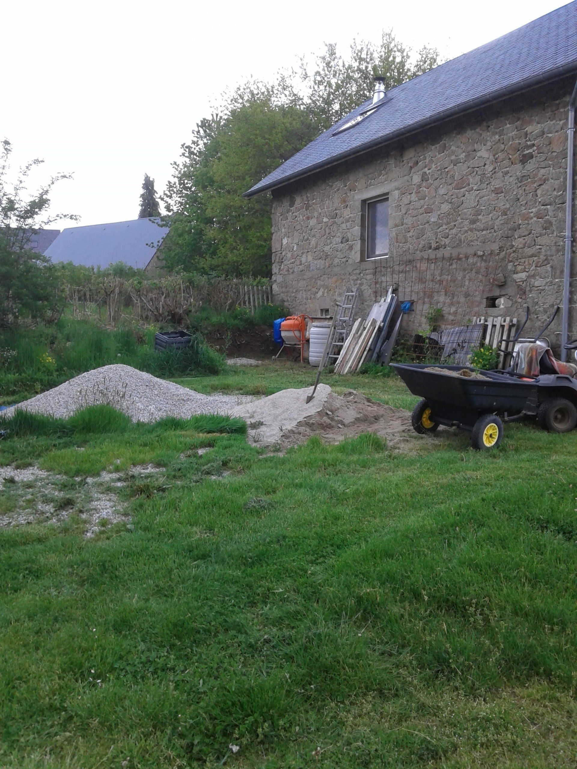 Op een mooie zonnige dag heb ik de zandbult naast de grange opgeruimd. Dit zand heb ik in het gat gegooid naast het zwembad. Het zand is weg, het gat is minder diep en nu nog het grind uit harken en daarna kan de camper weer op z'n plek staan.