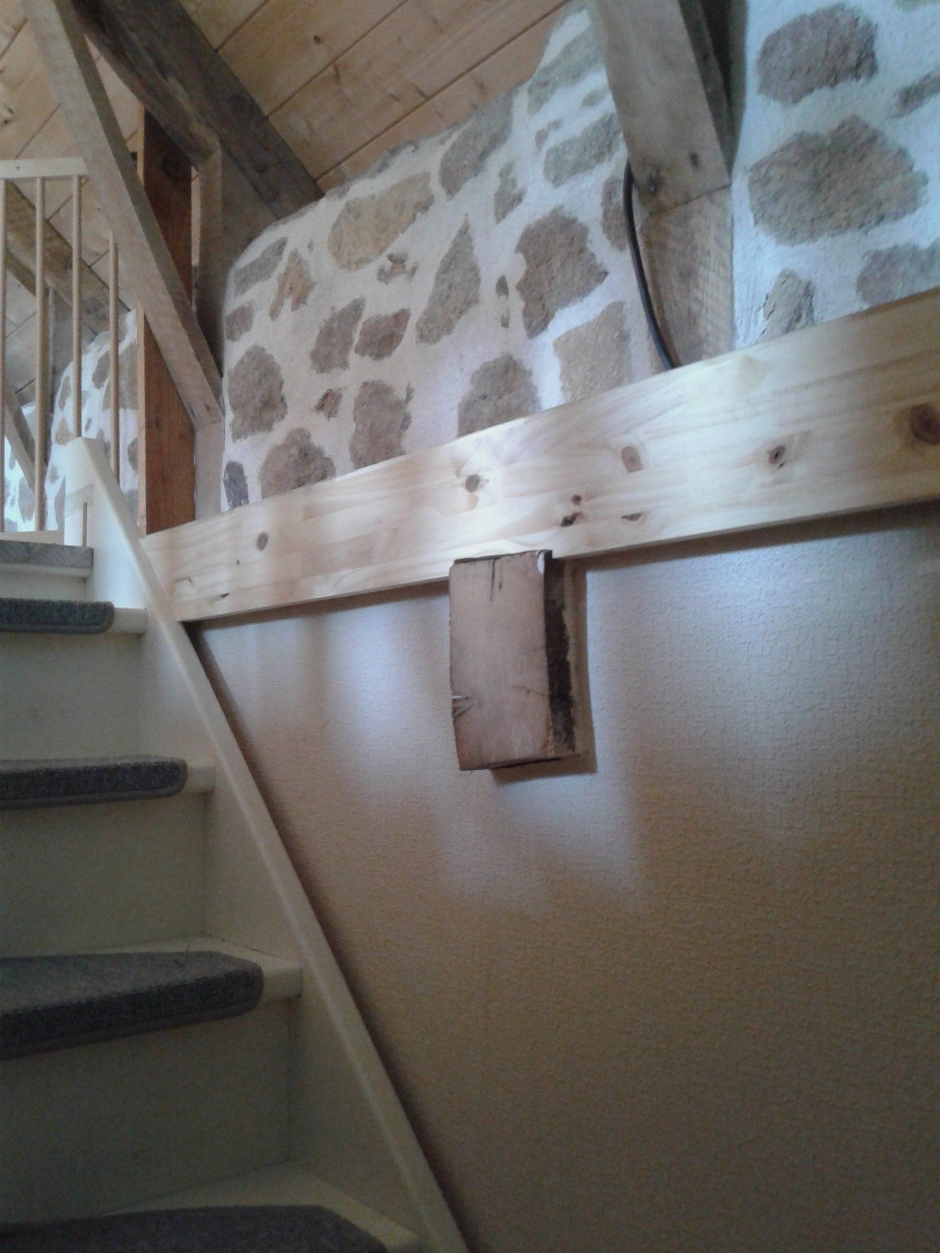 En bij de trap in het vakantiehuis moest nog een rand netjes worden afgewerkt met een plank. Na deze op maat te hebben gemaakt kon ik hem vastschroeven. Dat op maat maken was niet gemakkelijk. Een scheve zijkant bij de trap, een vlakje eruit waar een oude draagbalk had gezeten. Maar uiteindelijk is het gelukt en heb ik beide kanten van het trapgat netjes afgewerkt.