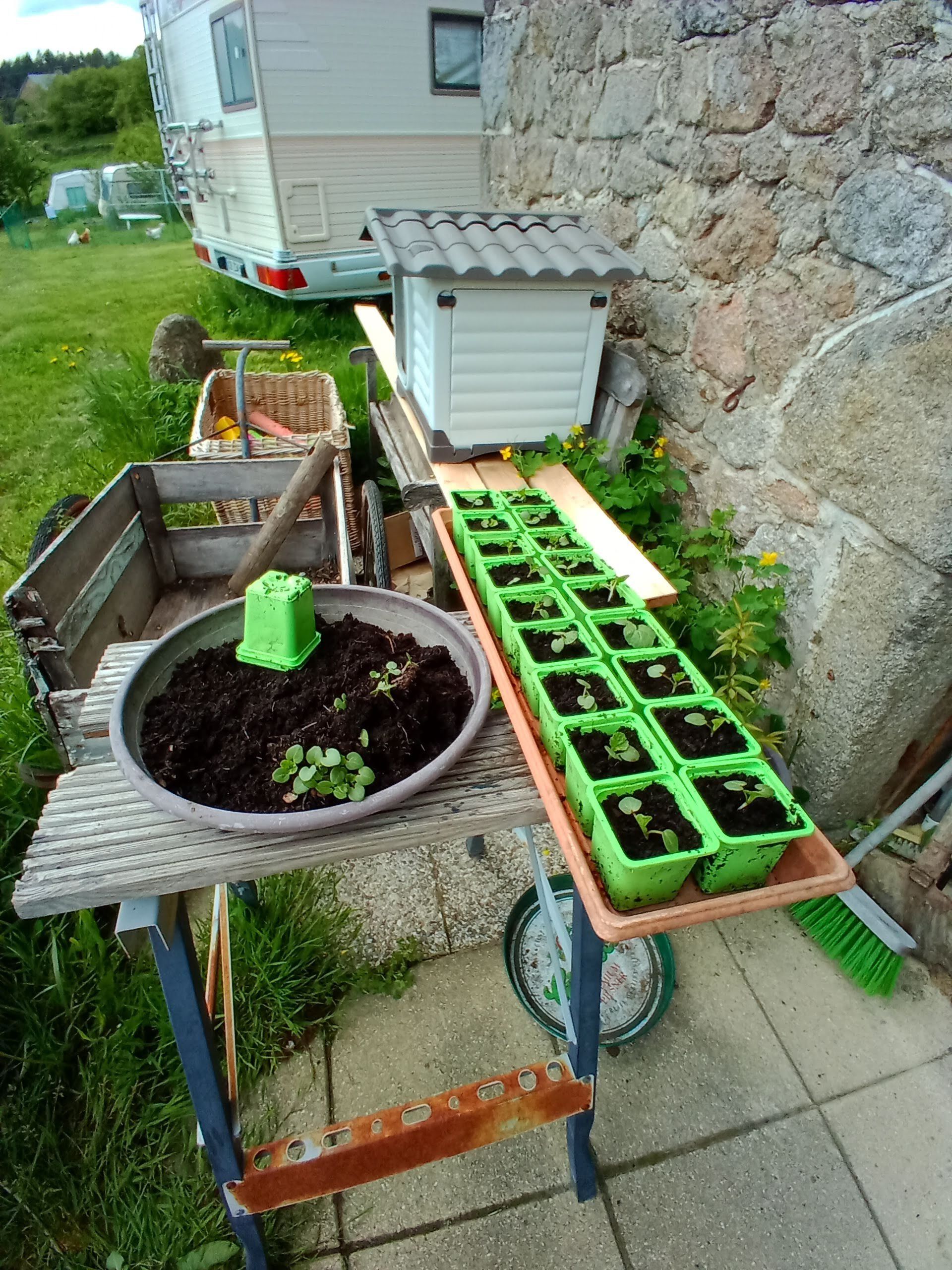 Ik heb deze week veel plantjes overgepoot in bakjes. Ze kunnen dan nog even doorgroeien en goede worteltjes maken zodat ik ze later in de tuin kan zetten. Zou ik dat nu al doen, terwijl ze maar 3cm hoog zijn, dan worden ze overwoekerd door de andere bloemen en komt er niets van terecht.