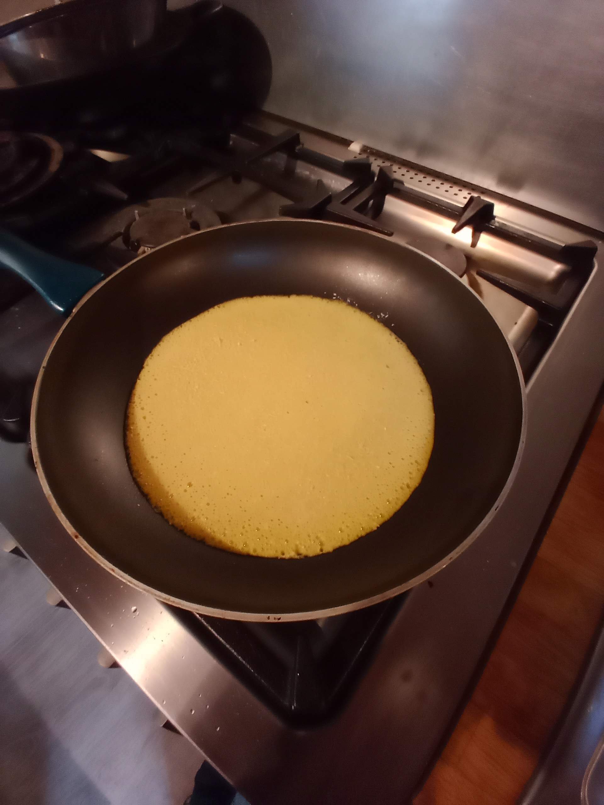 Ik heb deze week een paar keer pannekoeken gegeten omdat ik geen brood in huis had. En omdat ik mijn kippen regelmatig mais geef, zijn de eierdooiers heel geel. Dat kun je ook aan deze pannekoek goed zien. Ik had in het beslag ook wat kokos gedaan. Het smaakte heerlijk.