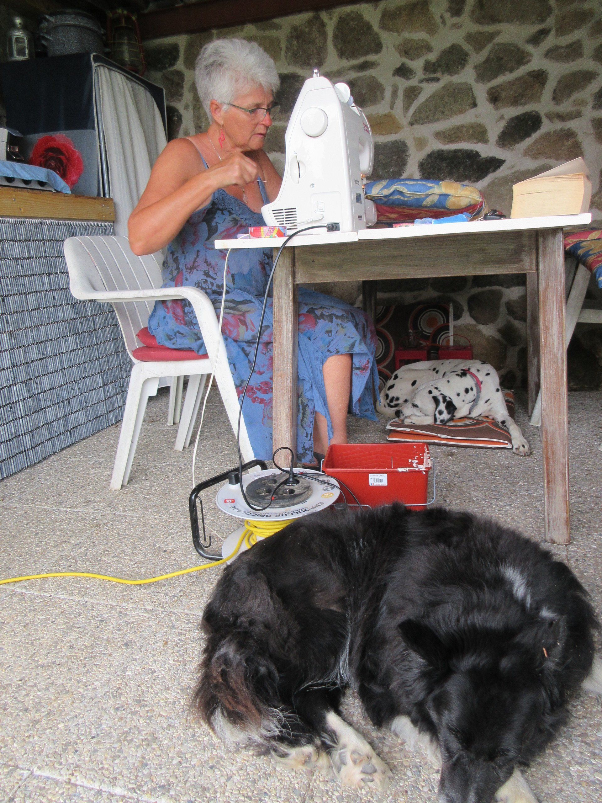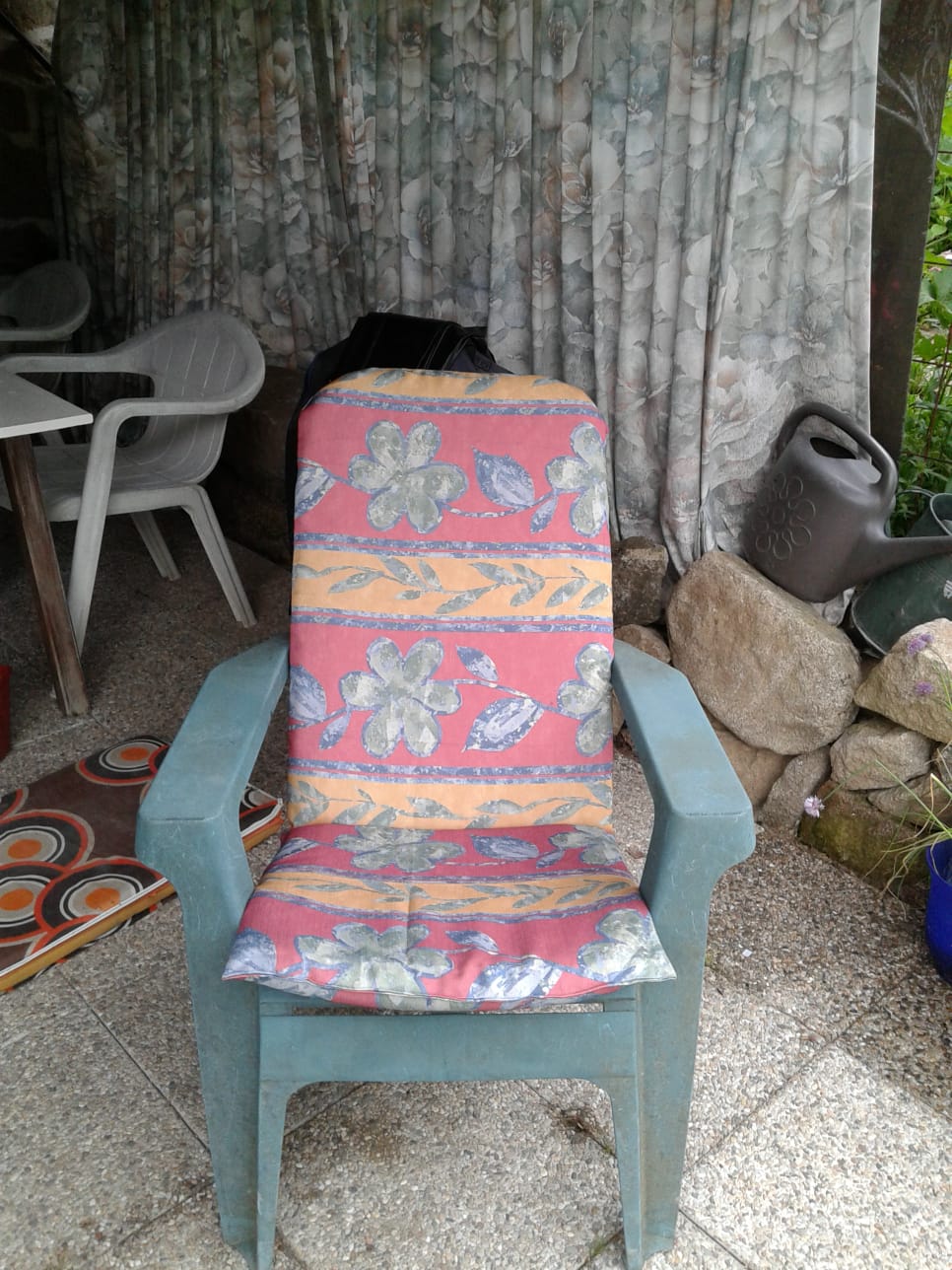 De kussens voor de stoelen waren niet mooi meer. Ik heb achter de naaimachine, in de buitenkeuken, nieuwe hoezen genaaid. Ik ben erg blij met het resultaat. Inmiddels heb ik 10 kussens opnieuw bekleed. Maar ik ben er nog niet mee klaar. Ik wil de kleine kussentjes ook nog doen.