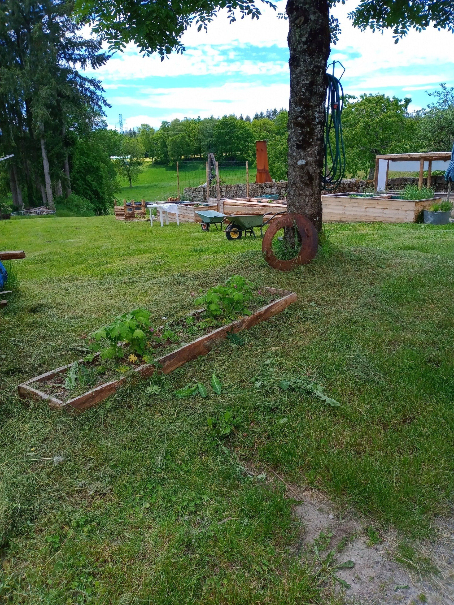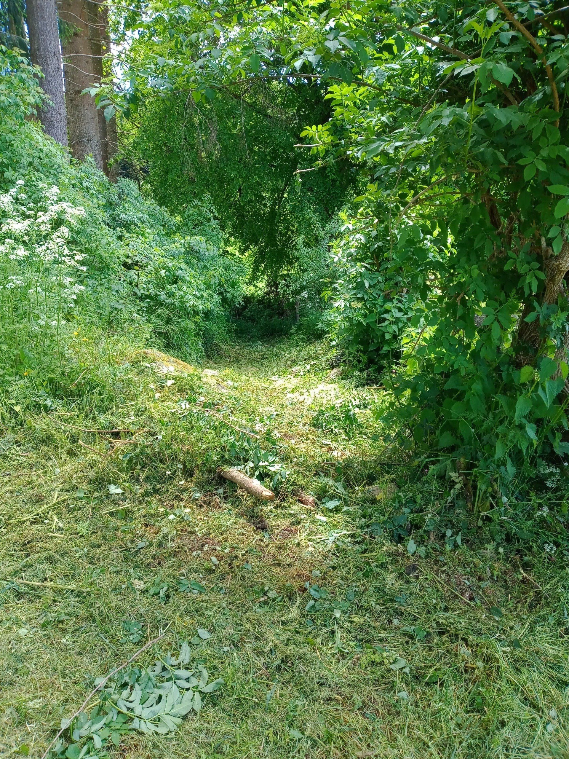 Zondag ben ik met de bosmaaier rondgeweest. Het onkruid bij de borders, caravans, camper en in het bos stond inmiddels 1 meter hoog. Bij elkaar, met de nodige pauzes ertussen, ben ik bijna 4 uur bezig geweest. En daarna was ik het zat en heb heerlijk in de schaduw onder de kersenboom gezeten. Kijkend naar de kippen en een boekje lezen.