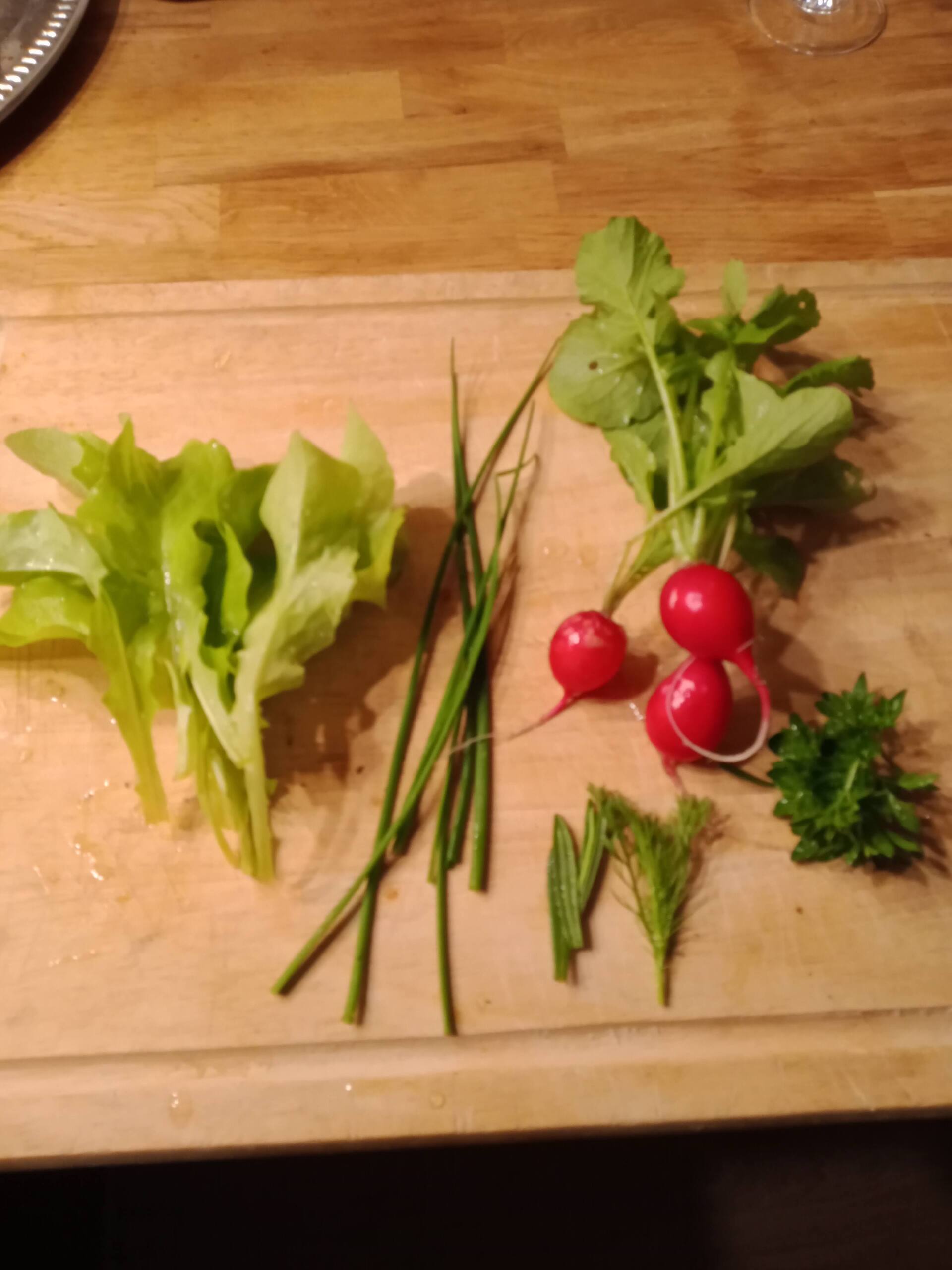 Ik heb de eerste pluksla uit eigen tuin gegeten. Samen met wat kruiden en radijs heb ik er een salade van gemaakt. En ik heb er twee visjes bij gebakken. Heerlijk.