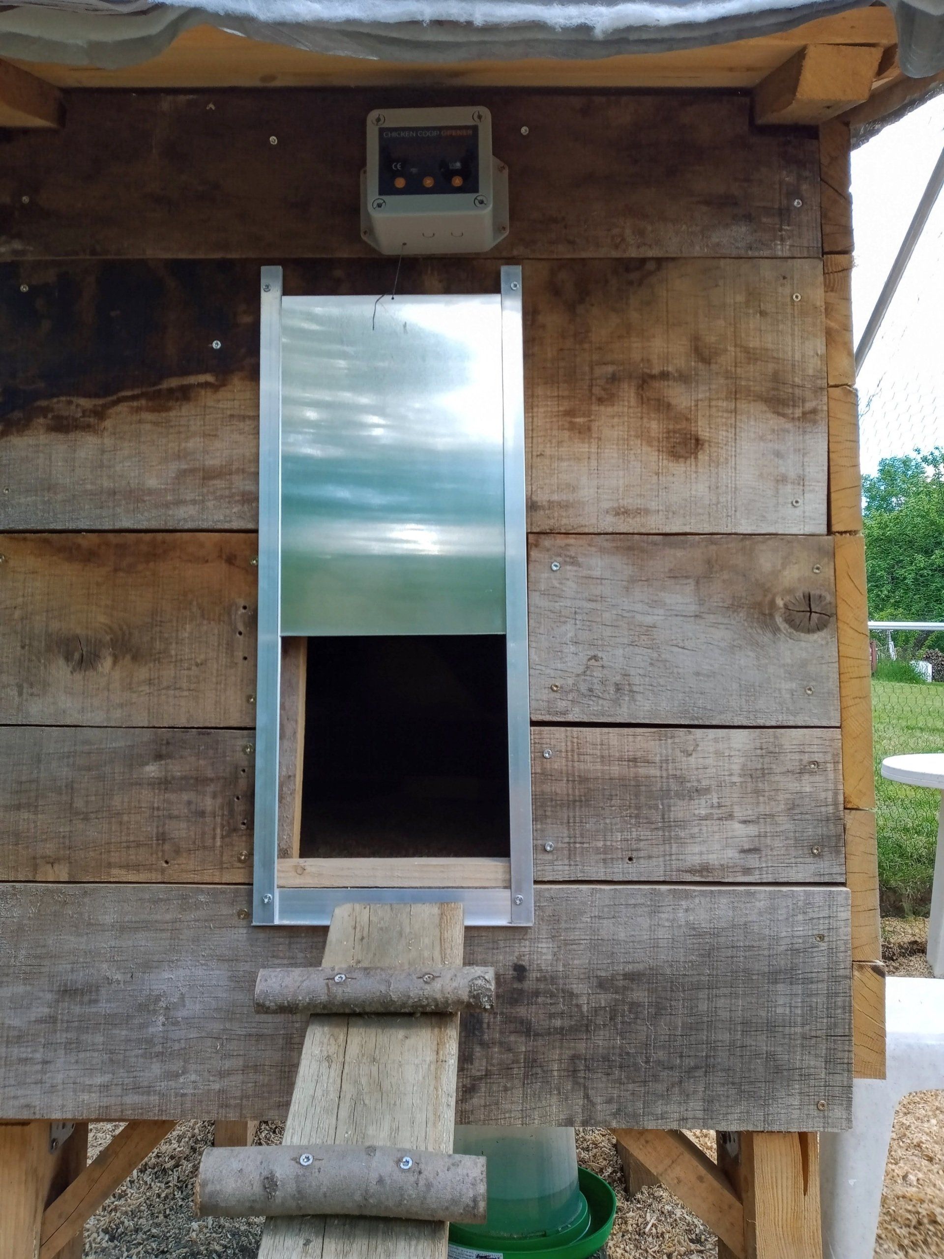 Ik heb op het kippenhok de automatische deur geplaatst. Die had ik al een paar weken in huis maar ik kwam er maar niet aan toe om hem te installeren. Ik had andere prioriteiten. Maar goed. Die deur werkt op een timer. Natuurlijk heb ik, na installatie, wel gecontroleerd of hij werkt. Gelukkig doet hij zijn werk goed en kan ik eindelijk een keer uitslapen. Het deurtje gaat 's morgens open om 7 uur en gaat 's avonds dicht om 11 uur. Ik dacht eerst ik ga hem programmeren op daglicht, maar als het warm is blijven die kippen langer buiten en gaan ze pas naar binnen als het echt donker is. Dus dan toch maar op de timer en dat werkt goed.