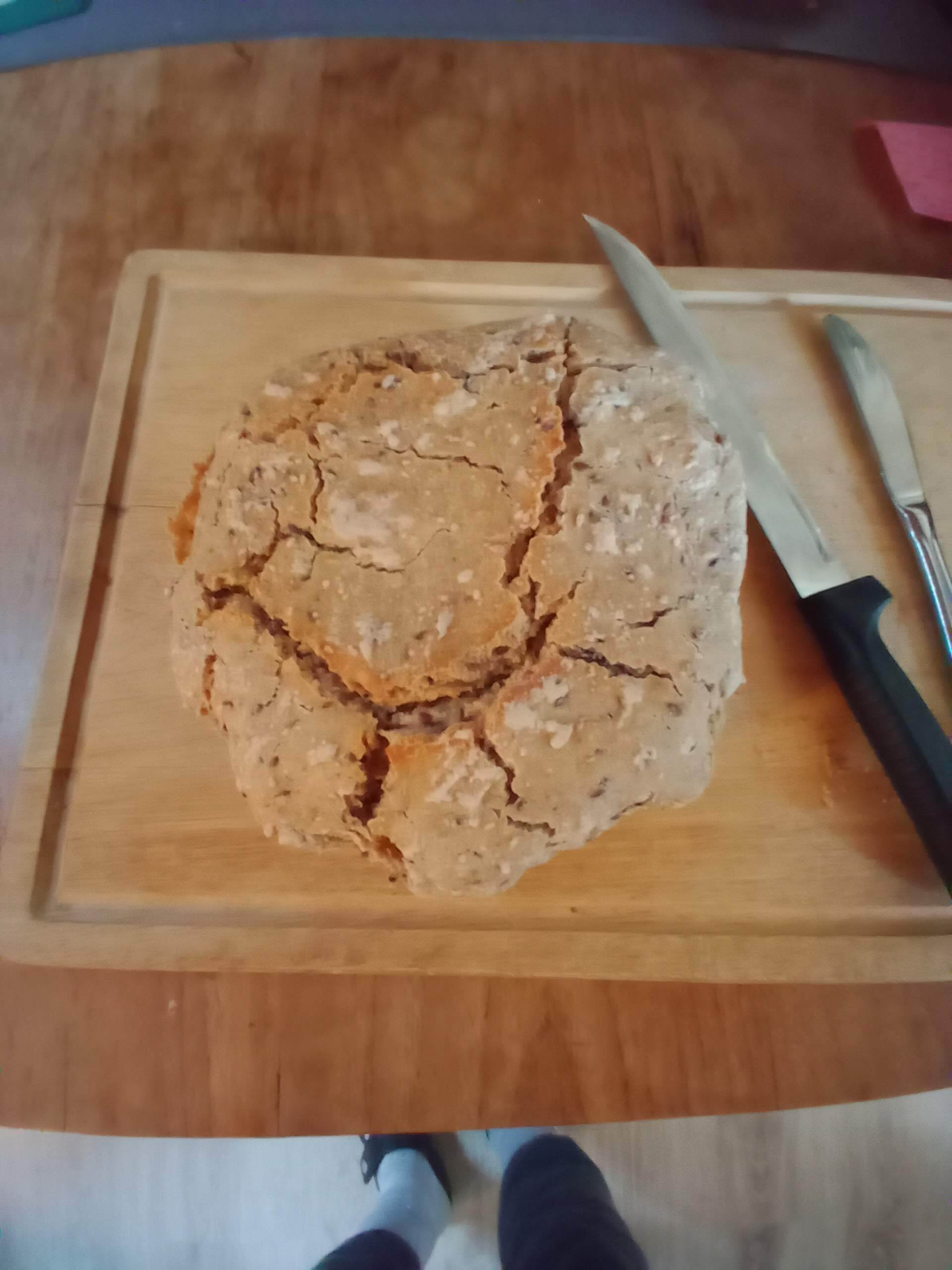 Ik heb weer eens geprobeert om zelf een brood te bakken. Op youtube heb ik filmpjes bekeken over: brood bakken zonder kneden. Dat ging prima totdat ik na het rijzen er een bol van moest maken en ik het in de gietijzeren pan moest doen. Ondanks dat ik meel op de plank en op mijn handen had gedaan, plakte het deeg aan mijn handen. Ik kon er geen kant mee op. Uiteindelijk is het wel gelukt maar ik zat er wel onder. Achteraf denk ik dat ik er een beetje te veel water in heb gedaan. Dit zijn van die stunten waar ik zelf smakelijk om kan lachen. Na het afbakken smaakte het brood prima. Nou ja: de volgende keer beter, maar dan met minder water. Als je die filpmjes op Youtube ziet lijkt het niet moeilijk, maar ondertussen.....