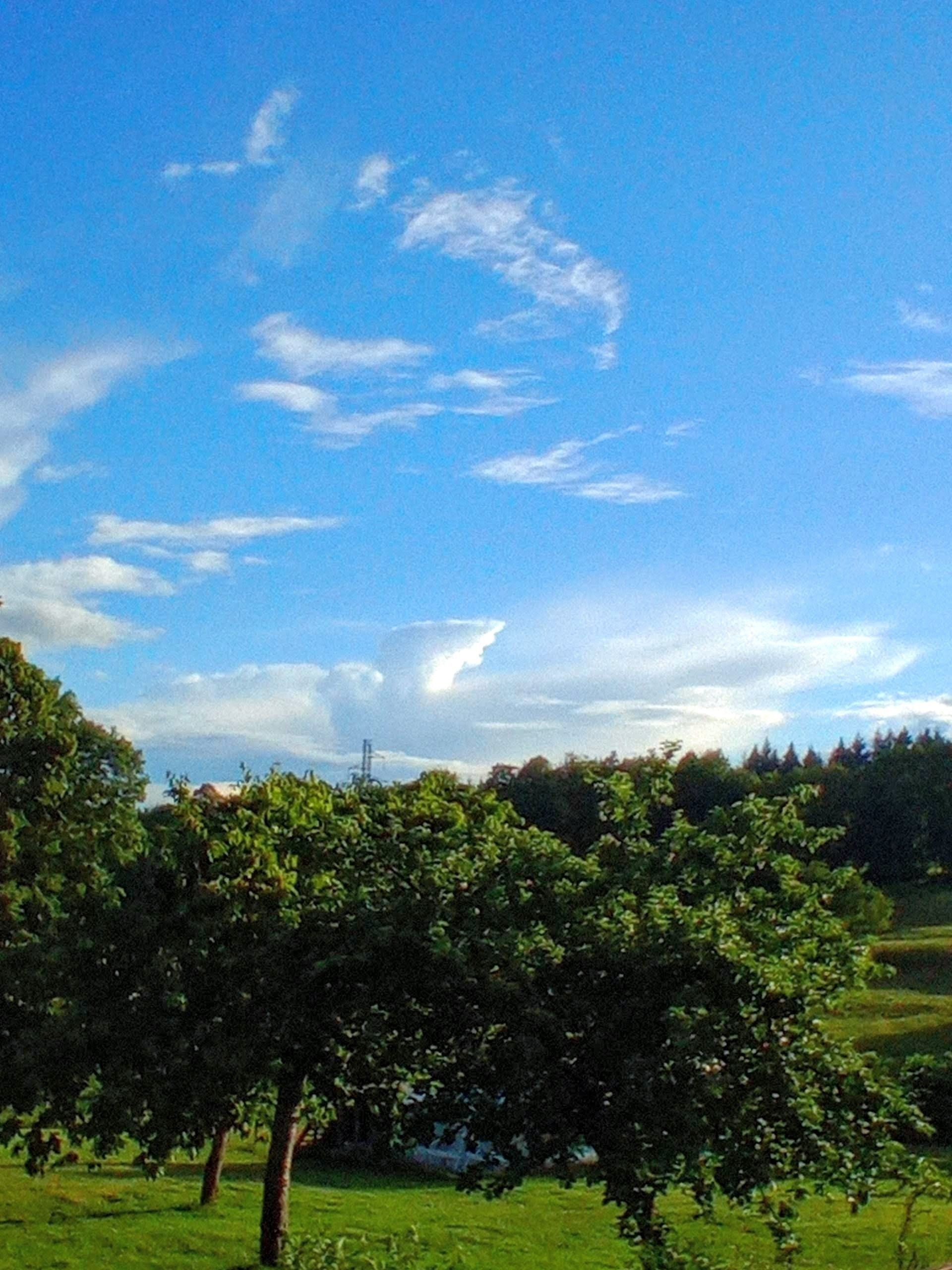 Op een dag, hadden we een prachtige wolken lucht om ons heen. Achter mijn huis, het noorden, was de lucht helemaal donker. Boven de Cantal, in het oosten aan de andere kant van de rivier de Dordogne, waren prachtige bloemkool wolken tegen een strak blauwe lucht. En in het westen aan de kant van de caravan waren de wolken heel fijn. Ik zag zelfs een wolk in de vorm van een Engel net boven de bomen.