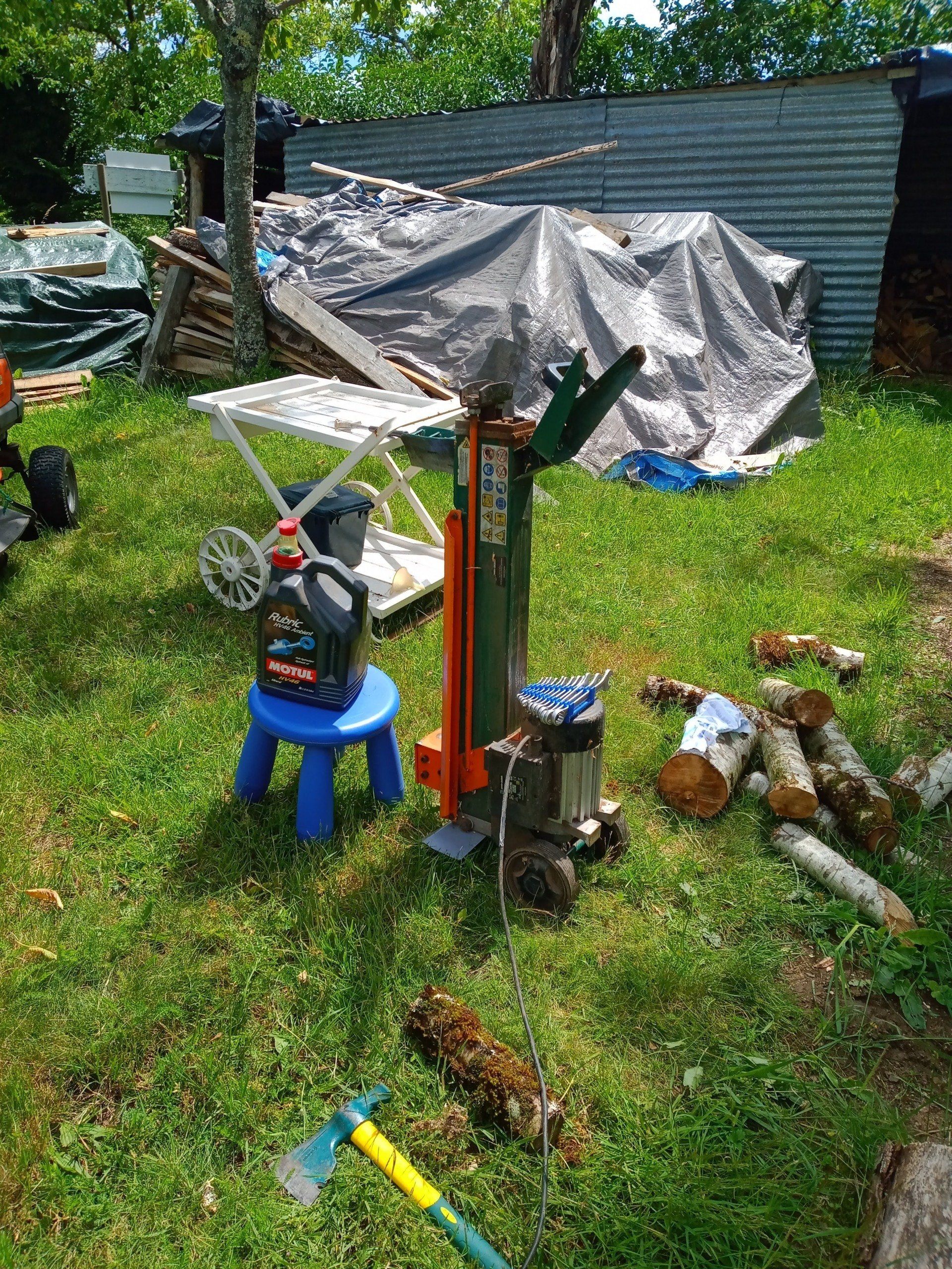 Ik wilde gisteren een bult met hout kloven en opruimen, maar de klover deed het niet. Na even zoeken vond ik de plek waar ik de hydroloische olie in kon doen. De schroef zat natuurlijk te strak vast. Uiteindelijk is het gelukt om die schroef los te krijgen en kon ik de olie aanvullen. En nadat ik hem weer op z'n pootjes had gezet, deed hij het weer en kon ik de bult met hout kloven en opruimen. En ook dat kon ik van mij to-do lijst afstrepen.