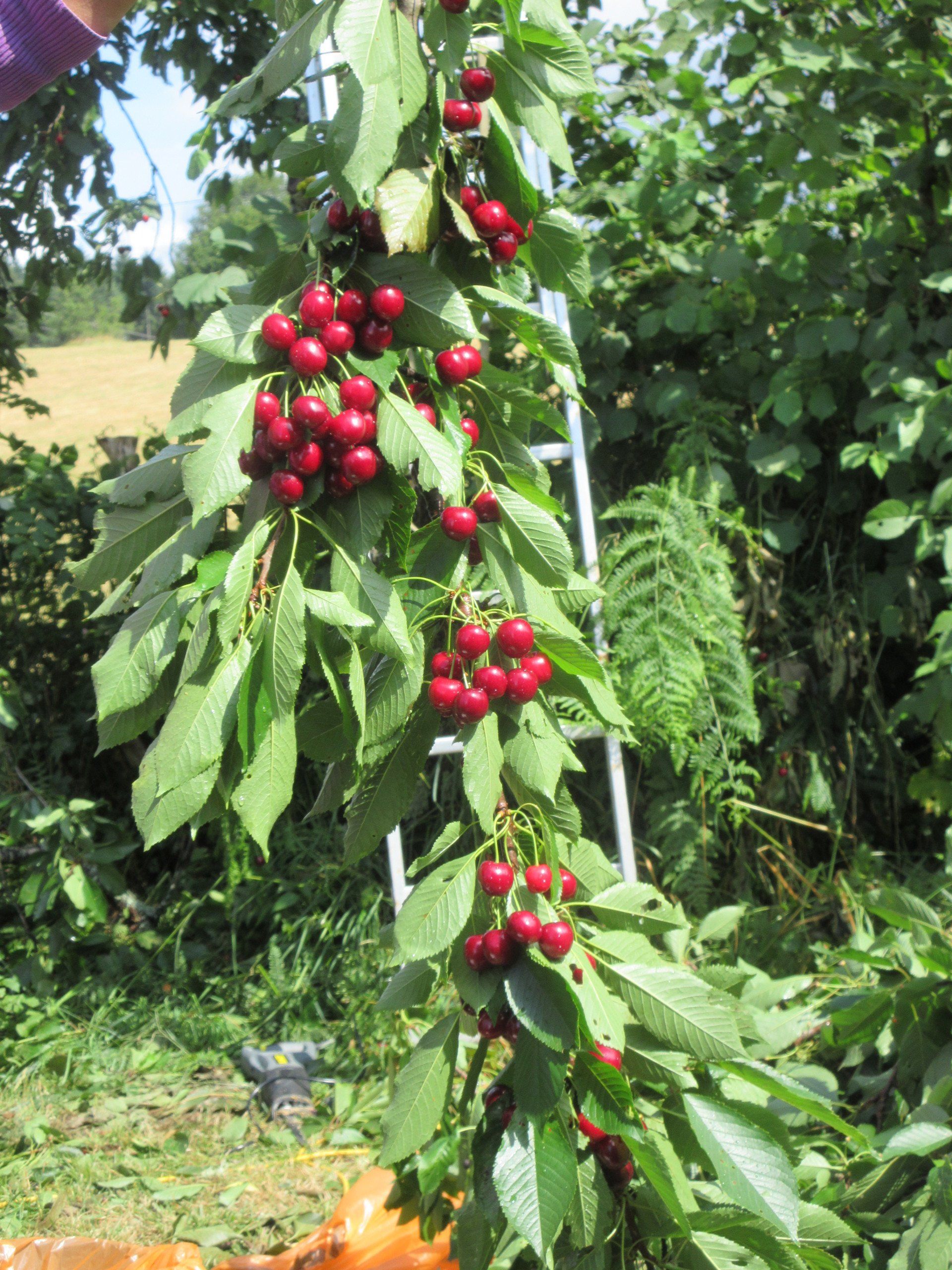 Toen mijn gasten waren vertrokken zijn die vrienden van mij weer teruggekomen in het vakantiehuis om mij verder te helpen. We hebben alsnog veel dingen samen gedaan waaronder heel veel kersen geplukt. De kersenboom achter de Grange was te hoog en zat vol met kersen. Het is hier gebruikelijk dat tijdens het plukken de bomen meteen worden gesnoeid. De takken zaten letterlijk van onder tot boven vol met kersen. Uiteindelijk zijn er 15 emmers vol met kersen geplukt. 3 daarvan zitten in mijn eigen vriezer en de rest heb ik aan vrienden en bevriende ondernemers in de omgeving weggegeven en ze waren er heel blij mee. In de winkel worden de kersen voor 6.00 euro per kilo verkocht. De kersen waren groot, vol met sap en heerlijk zoet. We waren precies op tijd met plukken want 2 dagen erna hebben we een dikke hagelbui gehad en zijn er vele kersen uit de andere 7 bomen op de grond gevallen.