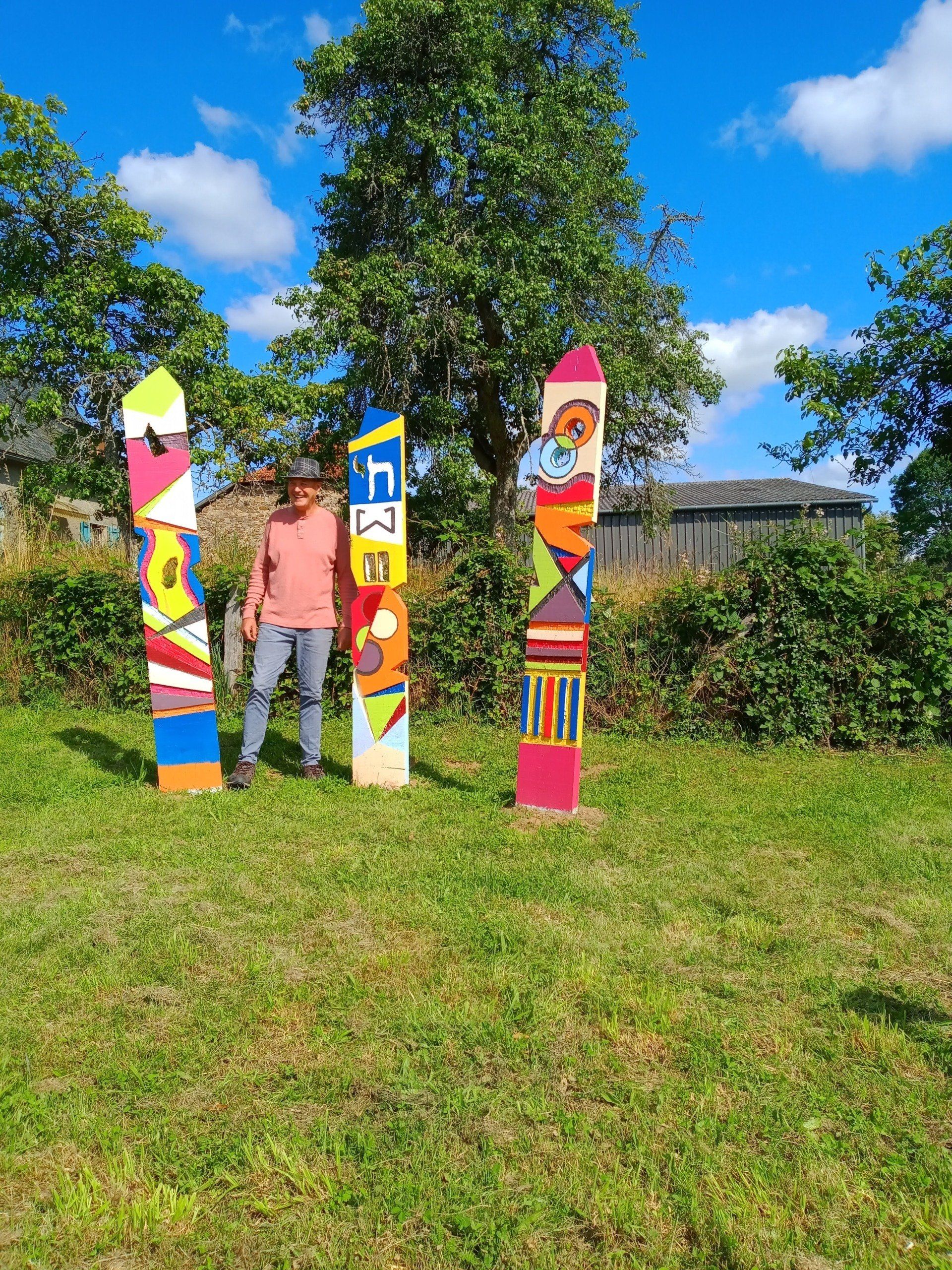 Gisteren was ik uitgenodigd bij vrienden voor het onthullen van beelden die hij had gemaakt. Hij wilde iets creatiefs doen en is maanden bezig geweest om dit te maken. Hij zijn een soort totempalen met een moderne inslag en hij heeft daar ook een stukje levenspad in verwerkt. Eerst hadden we met nog een paar vrienden de officiële onthulling met een glas champagne erbij. En daarna nog een hapje en een drankje. Hij had er echt een feestje van gemaakt.