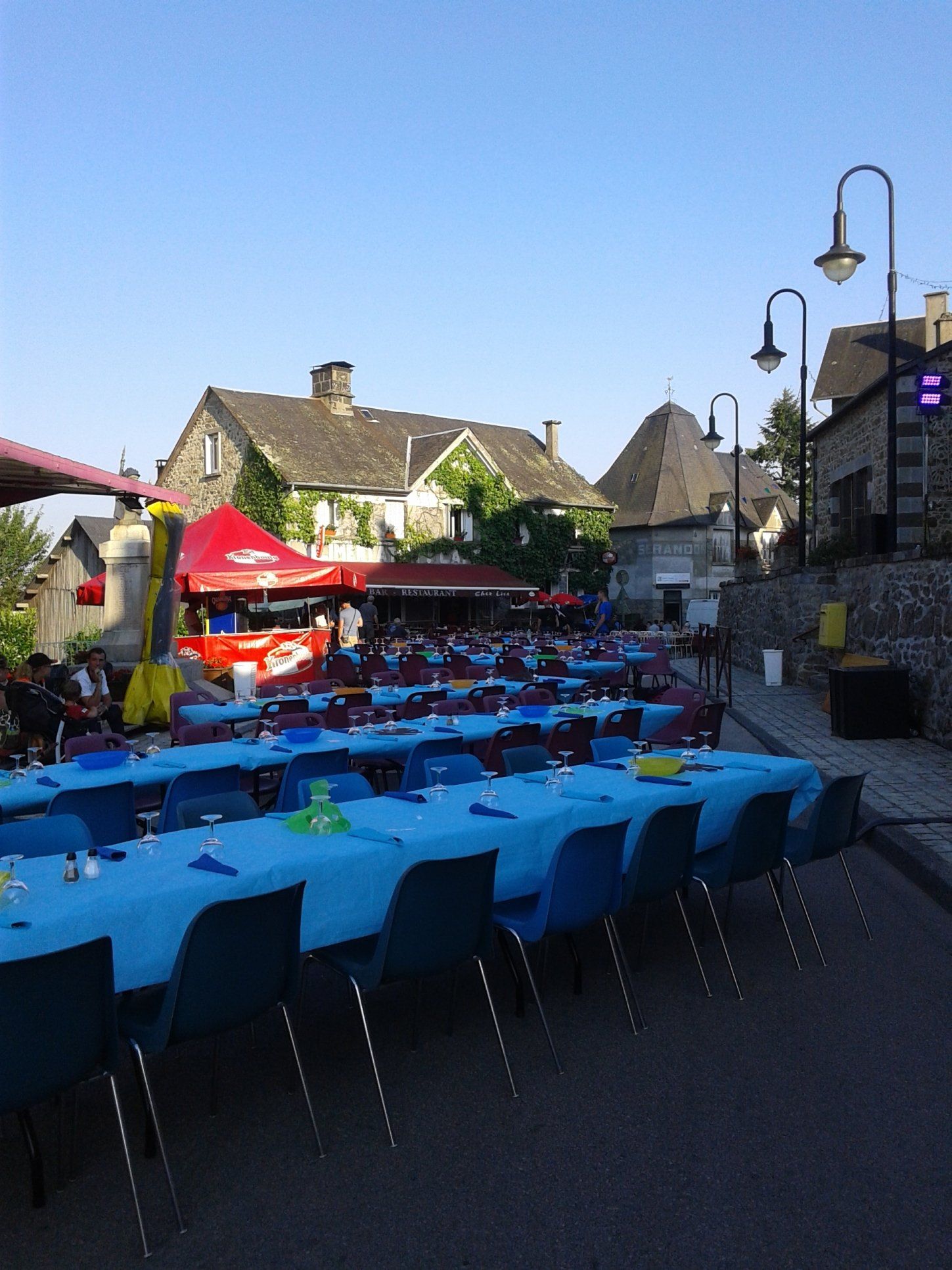 Het weekend van 4 en 5 augustus hebben we een feest georganiseerd in Sérandon met het feest comité. Vrijdagmiddag en zaterdag was het met z'n allen opbouwen. Het was hard werken in de volle zon. 's Middags werden ook de varkens aan het spit boven het vuur gehangen voor het menu van 's avonds. Er hadden zich 140 mensen opgegeven om bij ons te eten. 's Avonds was het gezellig druk. Het hele plein in het centrum van Sérandon zat vol, 140 gasten van ons en 120 gasten van restaurant Chez Lisa. De muziek was een groep van 3 personen die liedje zongen van over de hele wereld.