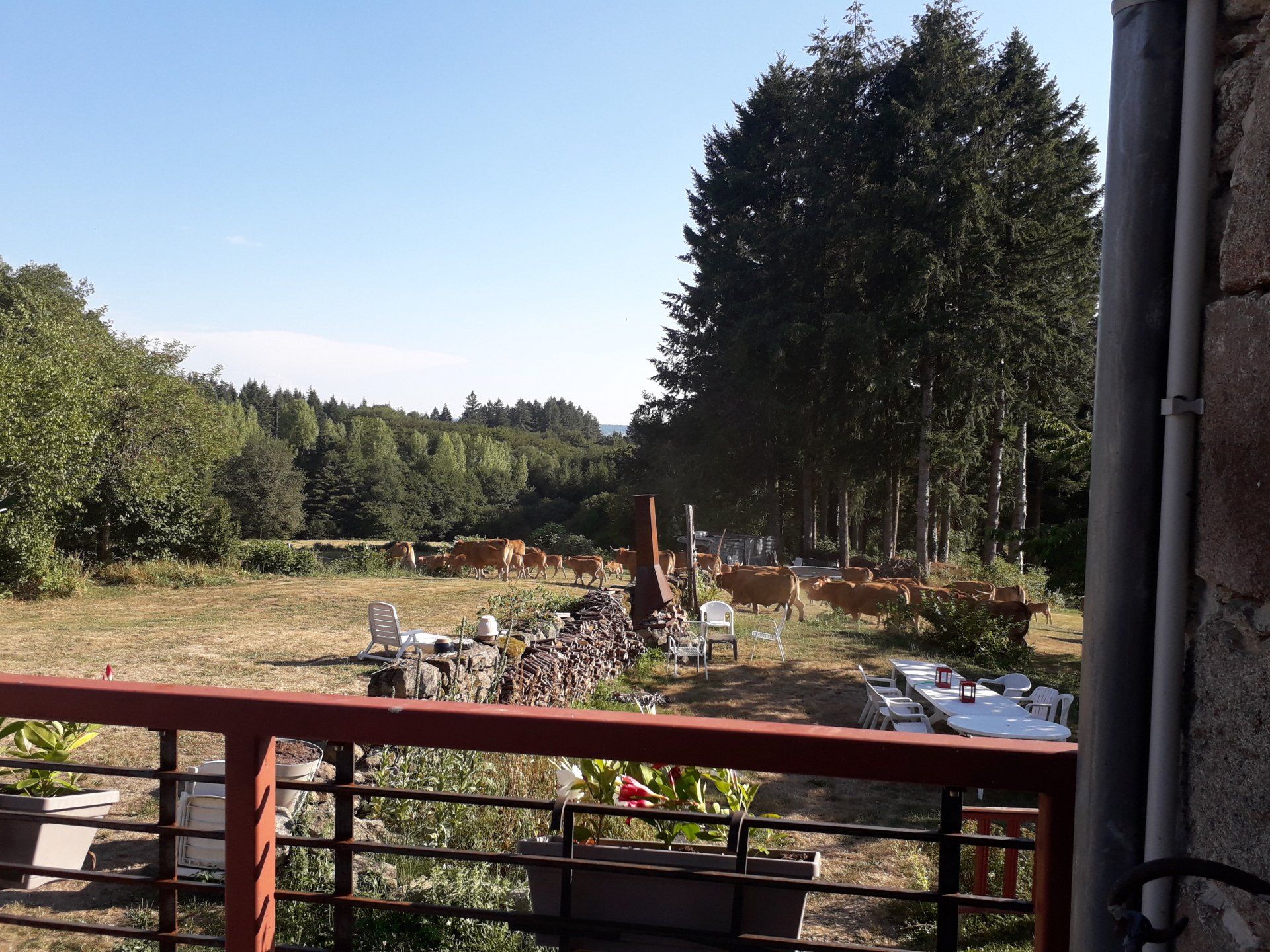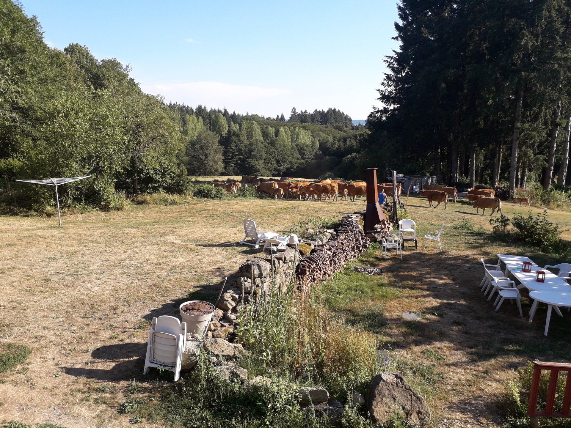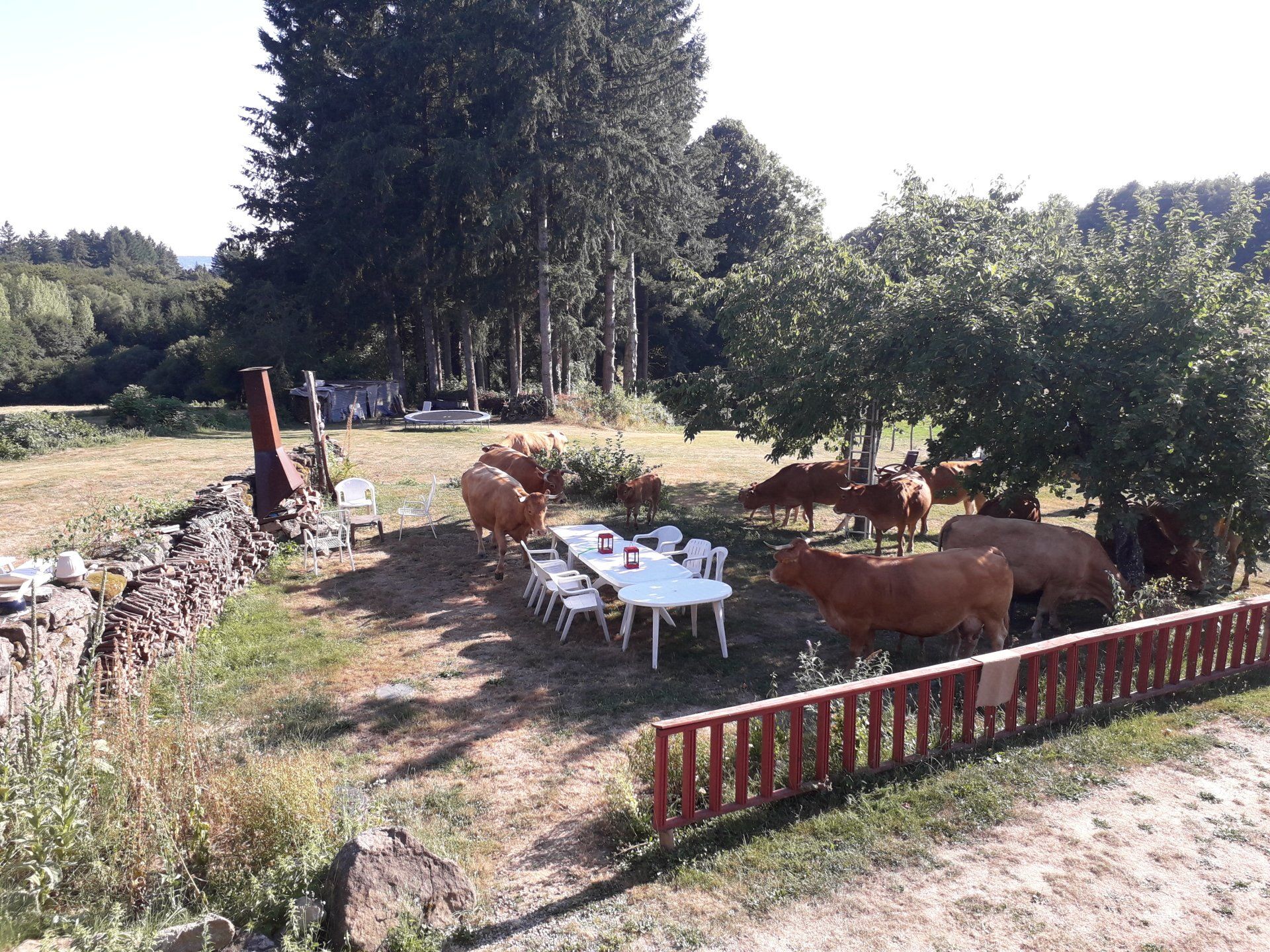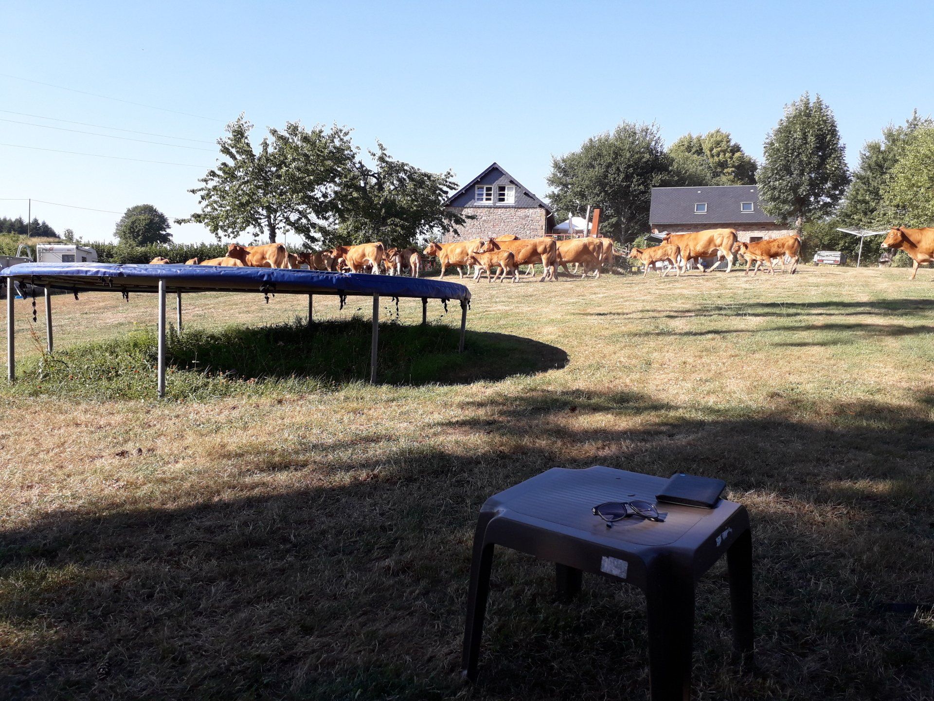Terwijl ik met mijn zus binnen bezig was op het internet, werd ik in paniek geroepen en kwamen ze op een drafje naar mij toe. Zij zaten achter op het terrein in de schaduw. Op een gegeven moment liep de kudden koeien van de buren mijn terrein op. Het prikkeldraad was nog niet gerepareerd door hem en het schrikdraad werkte niet. Een kalfje vond het gras bij mij wel erg lekker en besloot bij mij de tuin in te gaan. De rest van de kudde ging er achteraan. Toen de kudde verderop op mijn terrein stond te grazen kwamen mijn gasten op een drafje al roepend naar mij toe. Bij mij boven op het terras is het hoog en veilig. Ik ben naar mijn buren gerend om hulp te gaan halen. En samen met de buurman hebben we de koeien met veel geschreeuw weer in het weiland gekregen. De koeien zijn namelijk van de zus van mijn buurvrouw. Ze hadden gras en gevallen appels gegeten. En mijn gasten zagen zelfs dat er 1 koe uit het zwembad dronk. Gelukkig hadden ze geen schade aangericht. Wat ze wel achterlieten in de tuin was veel koeienstront. Toen alles weer achter de rug was was het inmiddels na 19.00 uur en hebben we eerst een drankje gedronken om bij te komen van de schrik. En daarna hebben we samen genoten van de gekregen maaltijd. Erg gezellig.