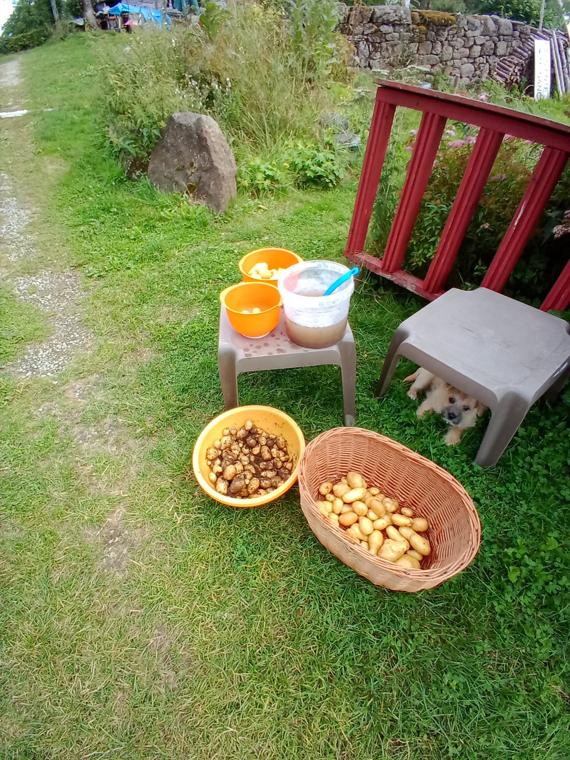 Begin van de week heb ik de helft van de aardappelen gerooid en schoongemaakt. De opbrengst is niet zoveel. Maar voor mij alleen is dat genoeg. De kleine aardappelen heb ik meegebakken in een groente ratatouille. Ik heb daarin ook een pepertje uit eigen tuin verwerkt. Die bleek na proeven erg pittig te zijn. Dus heb ik er maar een halve ingedaan. Ik heb gesmuld.