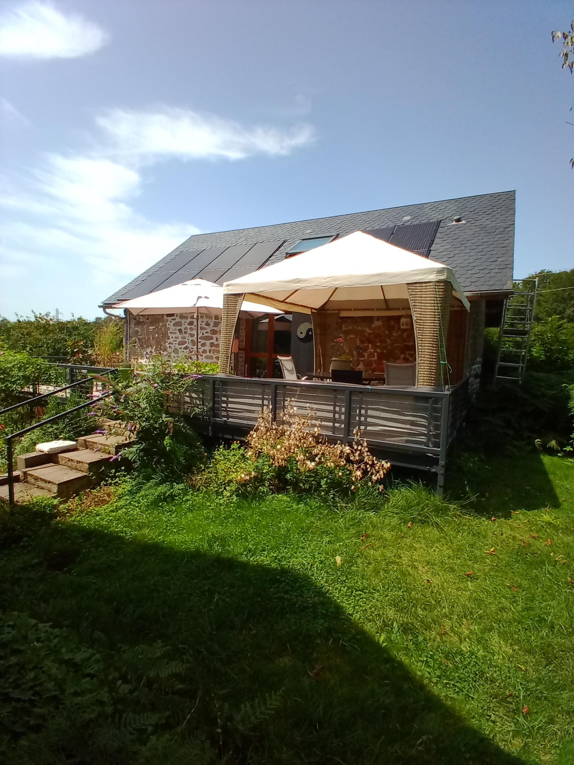 Nu het zo warm is, heb ik het doek weer op de partytent gelegd. Heerlijk om onder te zitten. Dat heb ik ook een hele dag gedaan. Maaar. Diezelfde middag kwam er ineens een dikke onweersbui met hevige windvlagen aan. Dus heb ik hem er weer af moeten halen. Helaas was het een storm in een glas water en ging de hevigste bui om ons heen.