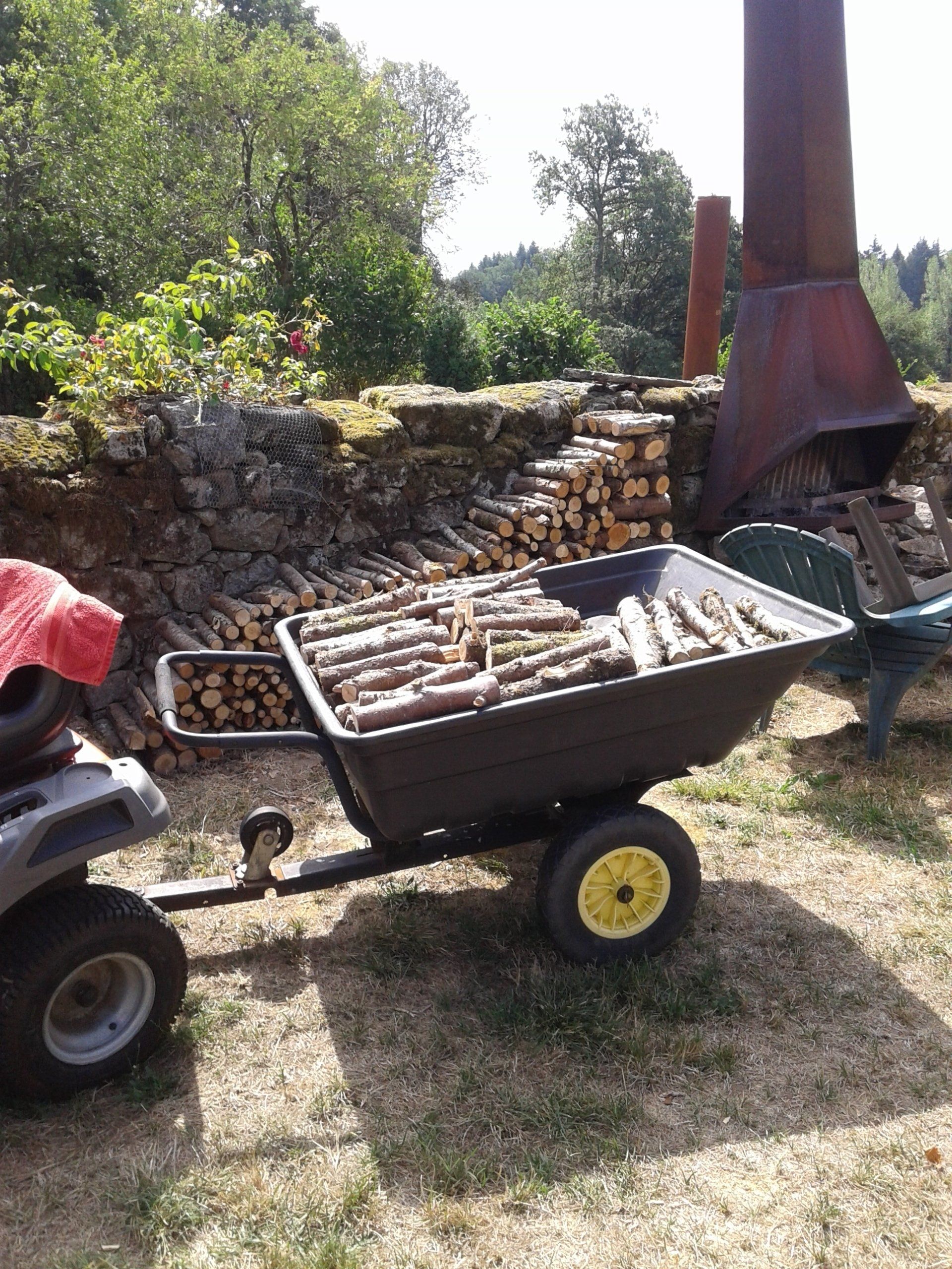 Ondertussen heb ik hout uit een houthok van beneden naar boven gebracht. Dat hout was inmiddels zover gedroogd dat ik daar deze winter mijn huis mee kan verwarmen. Achterin dat houthok lag ook nog dennenhout voor in de buitenhaard. En aangezien dat hout buiten tegen de muur op was, kon ik er weer een nieuwe voorraad neerleggen. Kunnen we weer een paar jaar in de zomer vuurtje stoken in de buitenhaard. Voor menig gezellig avondje samen met mijn gasten.