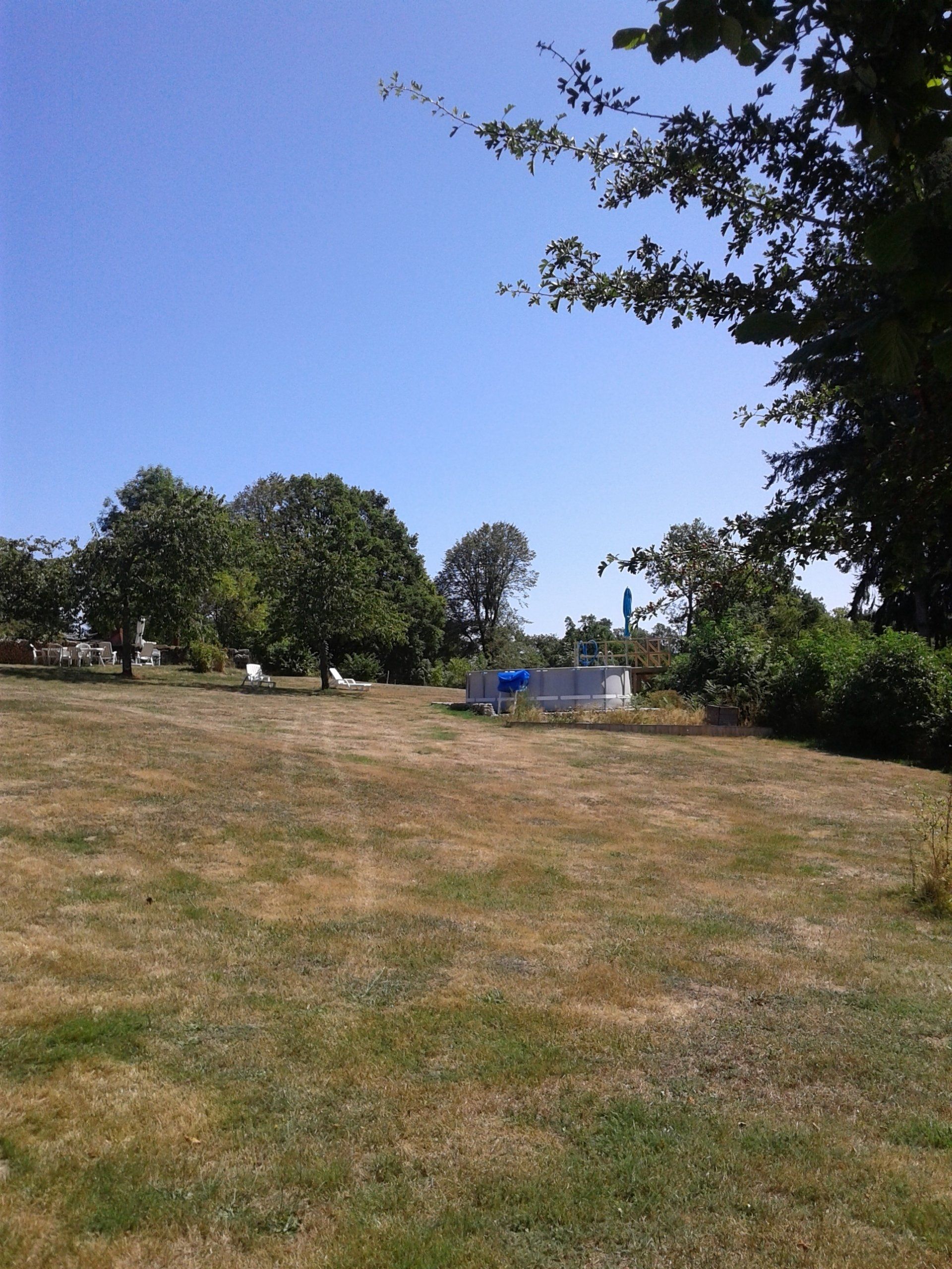 En omdat het erg droog is is mijn terrein veranderd in een dorre vlakte. Als ik over het terrein loop knispert het onder mijn voeten.