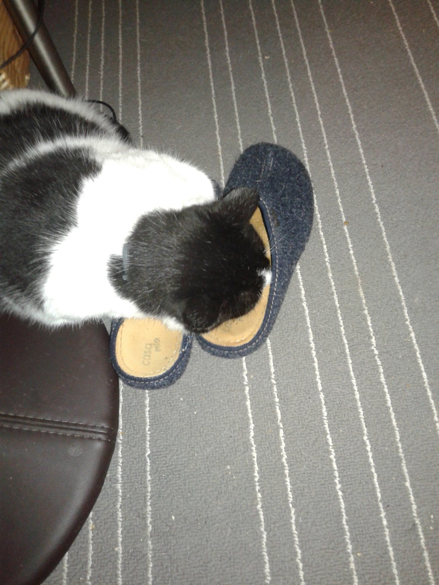 Kika één van mijn katten ligt vaak in de raarste standjes te slapen. Dit keer was het overdwars op mijn sloffen met een poot en haar neus erin. Zo ligt ze ook vaak boven op mijn schoenen. Alsof ze het een heerlijke geur vindt om te ruiken.