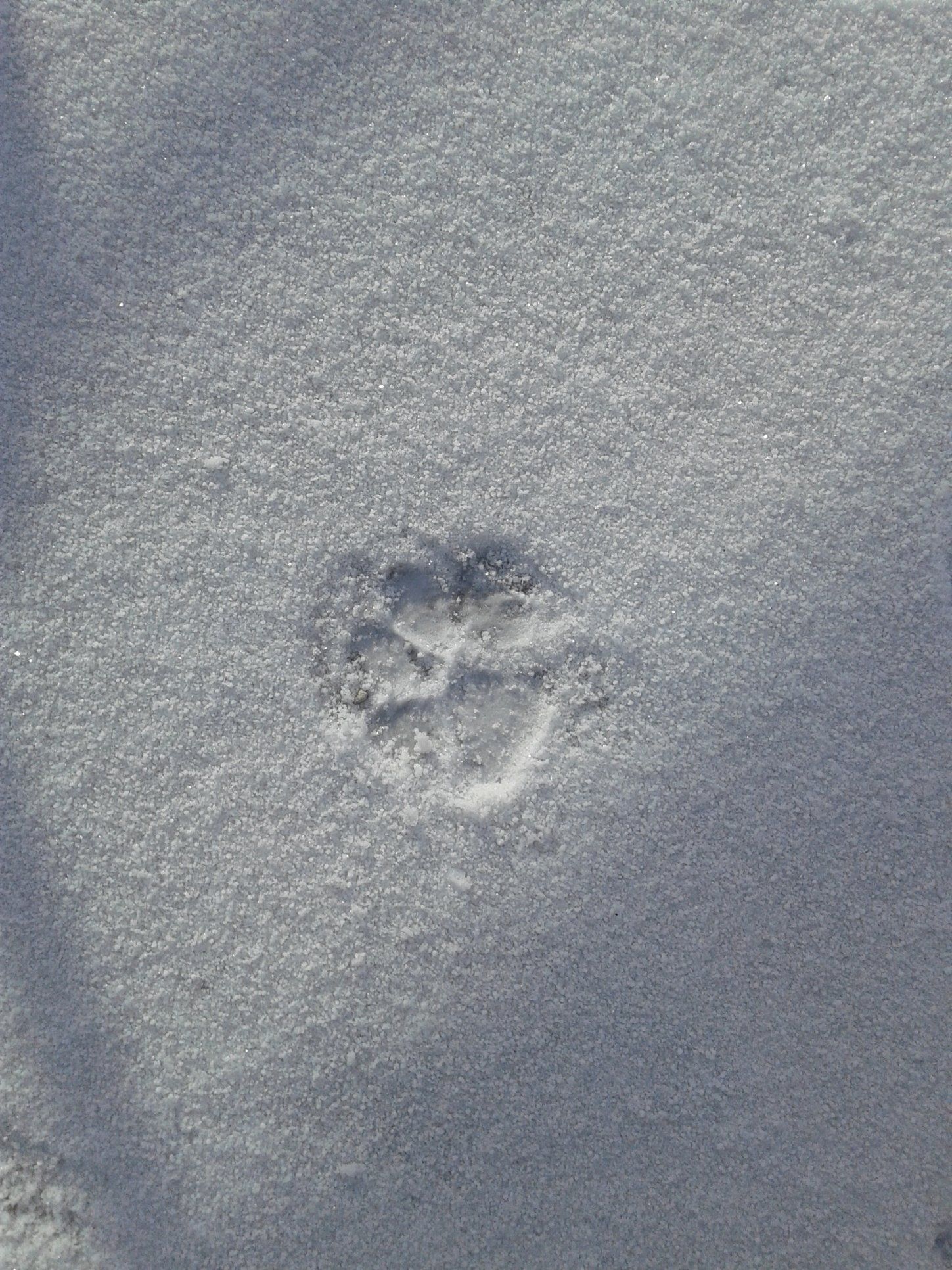 Van de week zag ik 's morgens in de sneeuw op het terras allerlei pootjes staan. Daarbij zaten afdrukken van grotere pootjes. Die zijn van een loslopende hond of misschien wel van een vos die op zoek is naar eten. Sinds ik geen hond meer heb zet ik nog wel eens restjes op het terras voor mijn poezen en de vogels. Dus denk ik dat ze daar op af gekomen zijn. En als ze dat één keer weten????