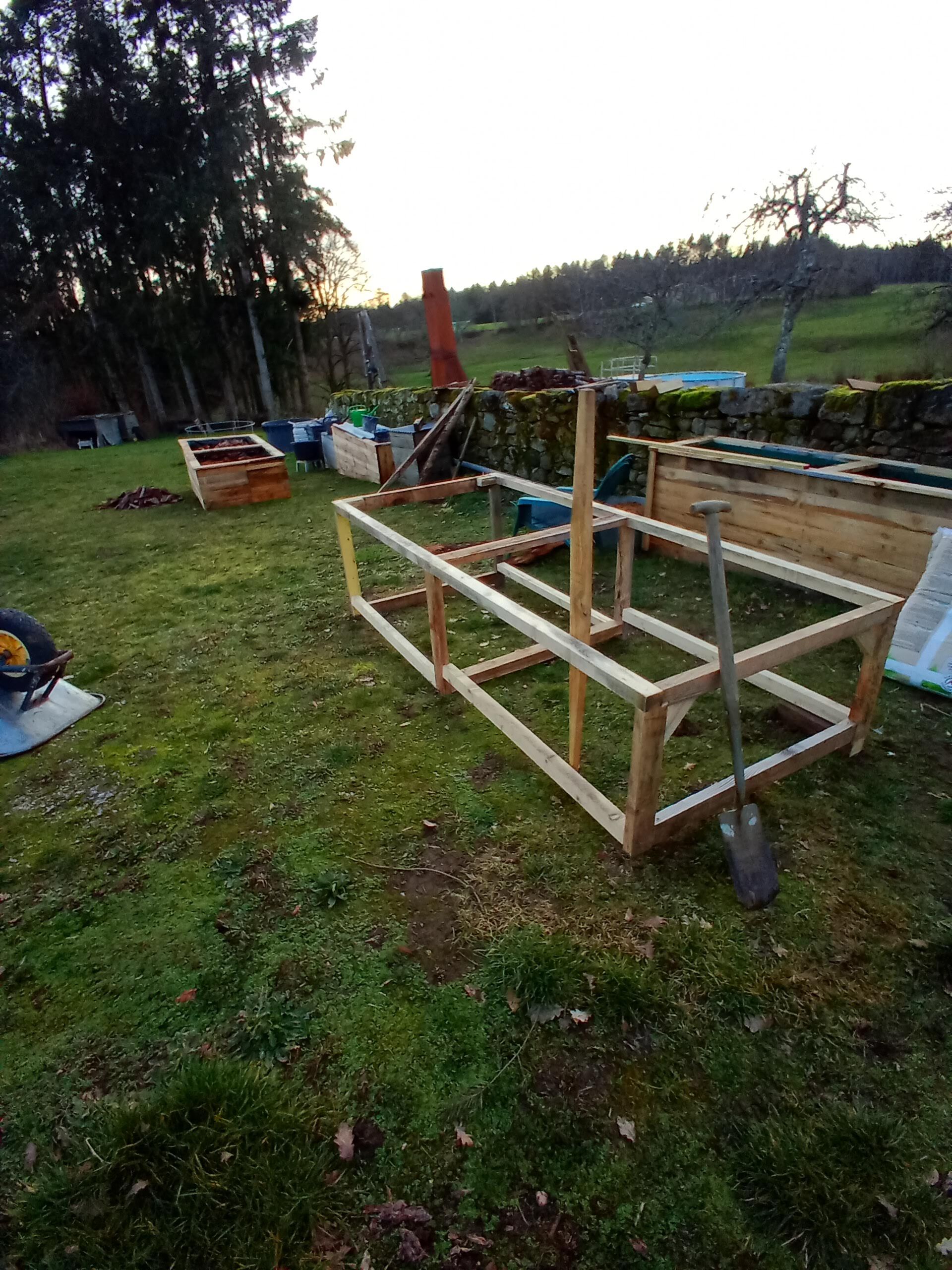 's Middags heb ik het geraamte van de 4e verhoogde groentebak gemaakt. Dat gaat niet zo gemakkelijk want alles is hier scheef. Elk paaltje moet apart worden opgemeten om de bovenkant van de bak waterpas te krijgen. En weer is het mij gelukt en het gaat steeds gemakkelijker.
