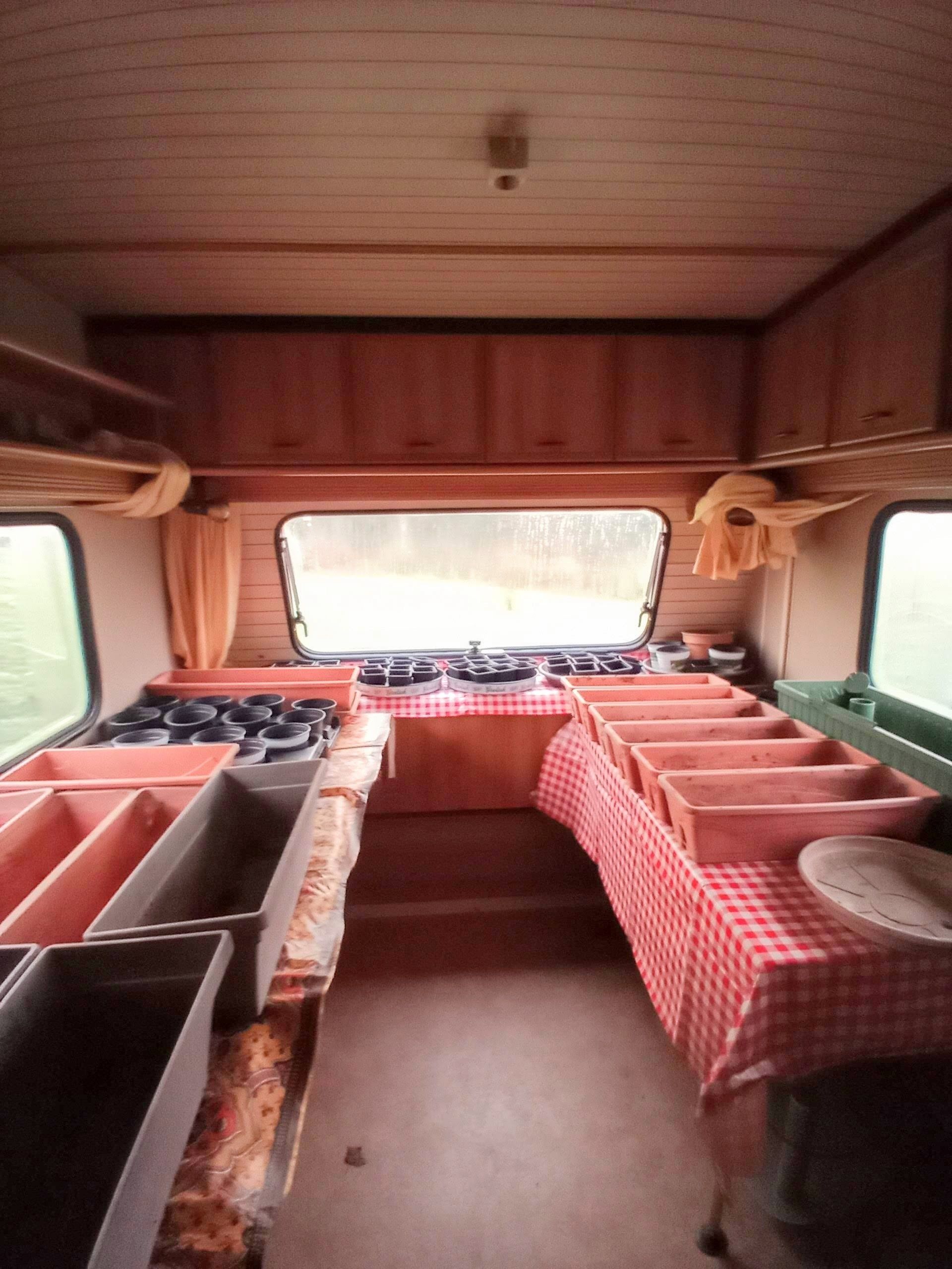 Ik kan proberen om de kleine caravan te gaan gebruiken als een soort kas. Via de ramen komt er de hele dag licht en warmte binnen. Dus heb ik er tafels ingemaakt met plastic tafelkleden er overheen en allerlei bakken en potjes verzameld. De tuinaarde heb ik inmiddels gehaald. En nu nog alle zaadjes halen. Maar die wil ik bij een tuincentrum gaan halen. Binnen een paar weken kan ik dan beginnen met zaaien.