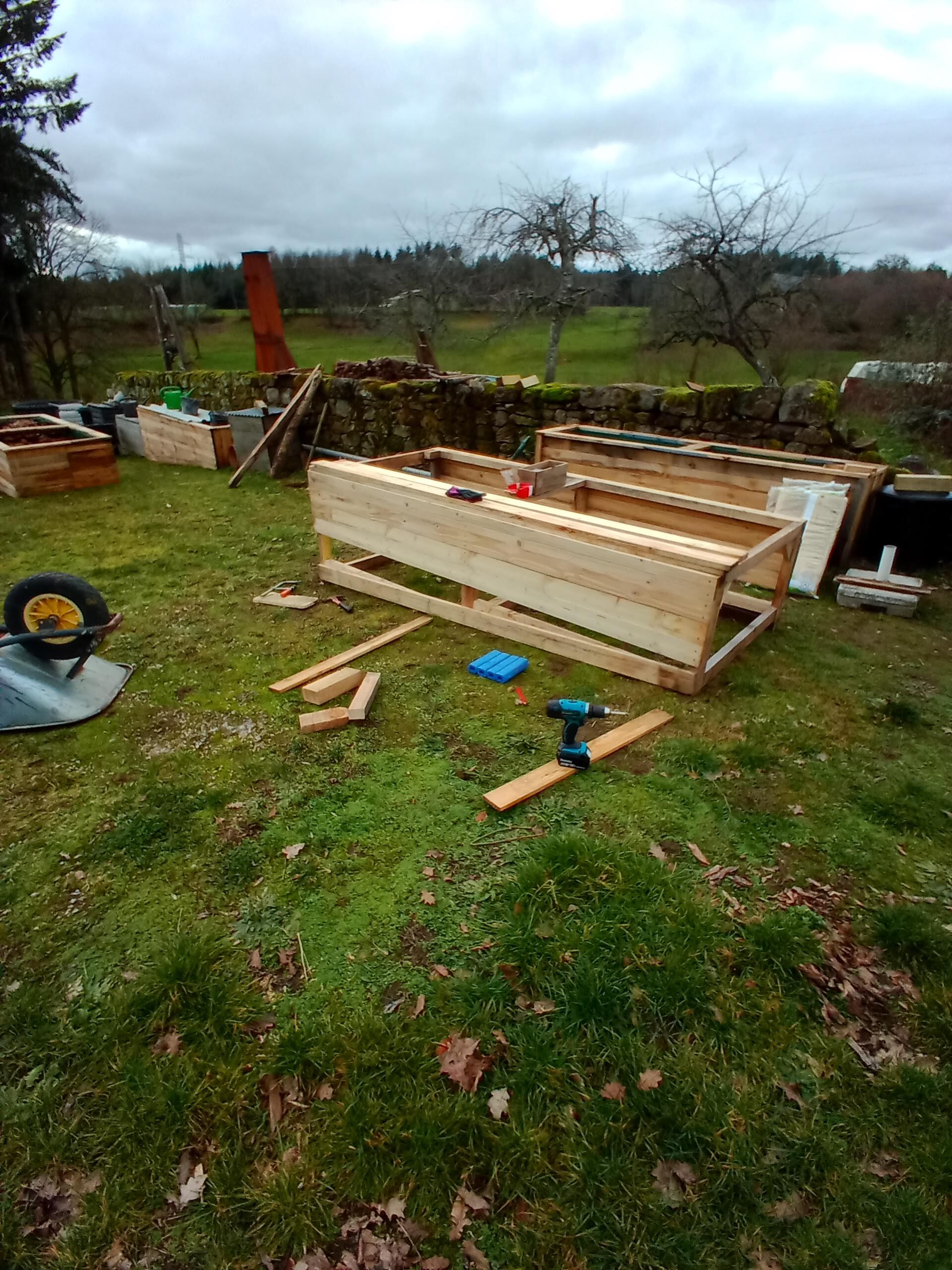 En ik ben begonnen met het bevestigen van de planken tegen de groentebak aan. Het is mij niet gelukt om het af te krijgen, want het begon weer te regenen.