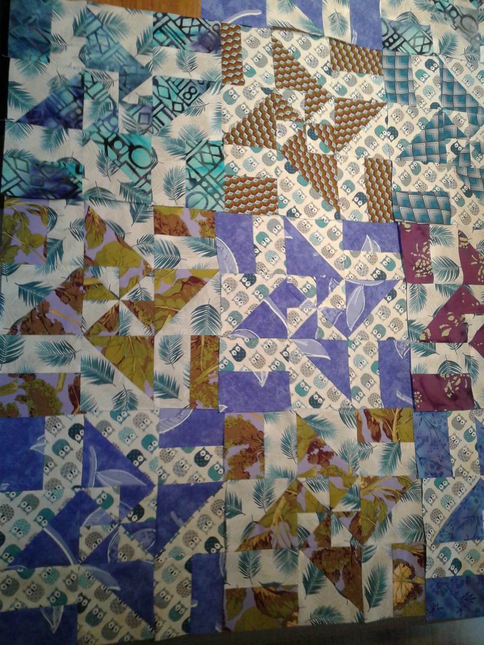 Ik heb bijna alle blokken van de quilt klaar. Ik heb een aantal blokken tegen elkaar aangelegd om een indruk te krijgen.